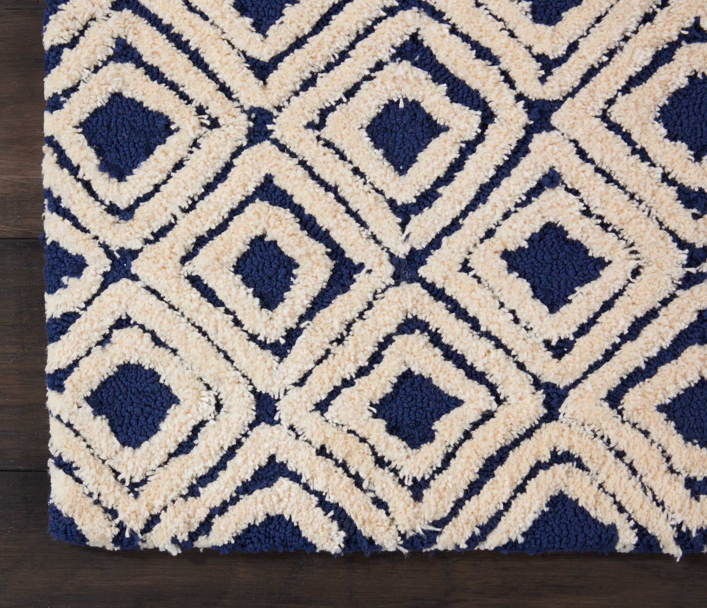 High-low pile construction creates a hypnotic interplay of diamonds on this superbly modern transitional rug. A deep navy blue field with patterns of beige make this Modern Deco collection rug a true statement piece in any room in the home. Each of these geometric rugs is hand tufted for superb dimension and texture.
