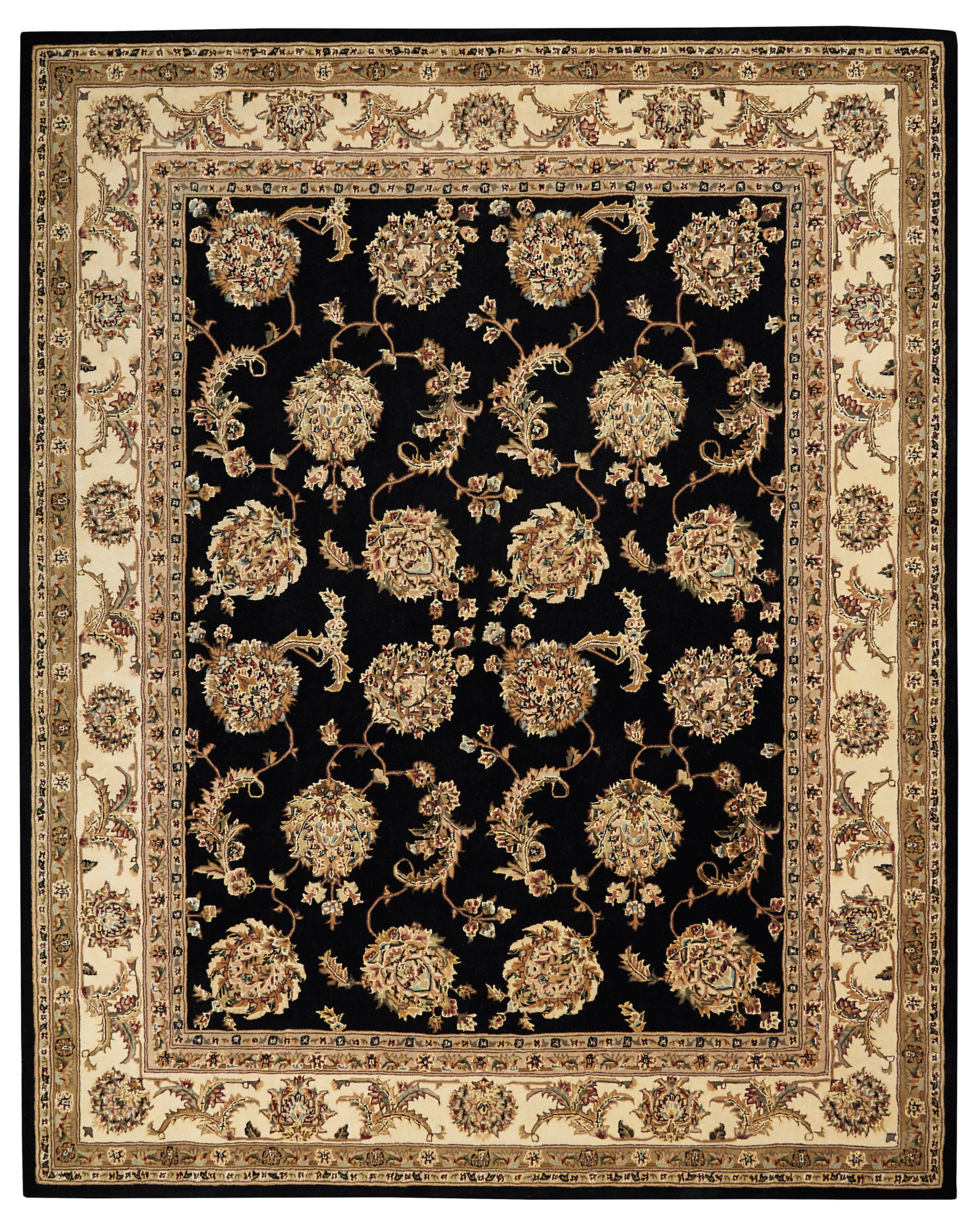 Antique elegance is replicated in this charming adaptation of a Persian traditional area rug. Lush flower heads and leafy vines spread out in playful symmetry across a ground of shimmering black bordered by pale beige and ivory – a regally appealing palette.