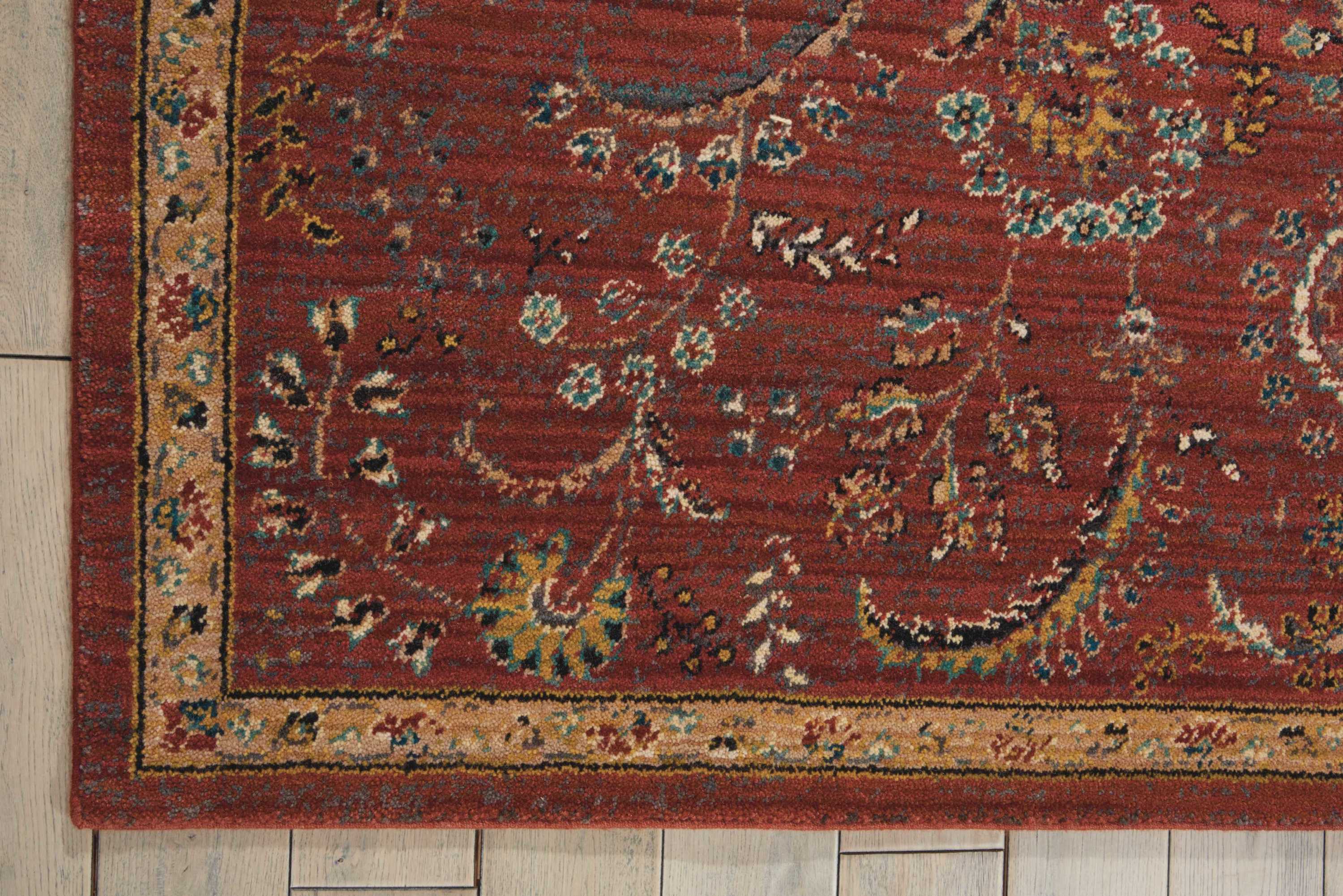 A resplendent rust background is artfully embellished with a delicate leaf, bloom and blossom design in luminous tones of gold, white, turquoise and black. Fantastic-to-the-eye and touch, space dyed for a stupendous saturation of color, this significant Nourison 2020 area rug is superlative in its tone, texture and dimension.