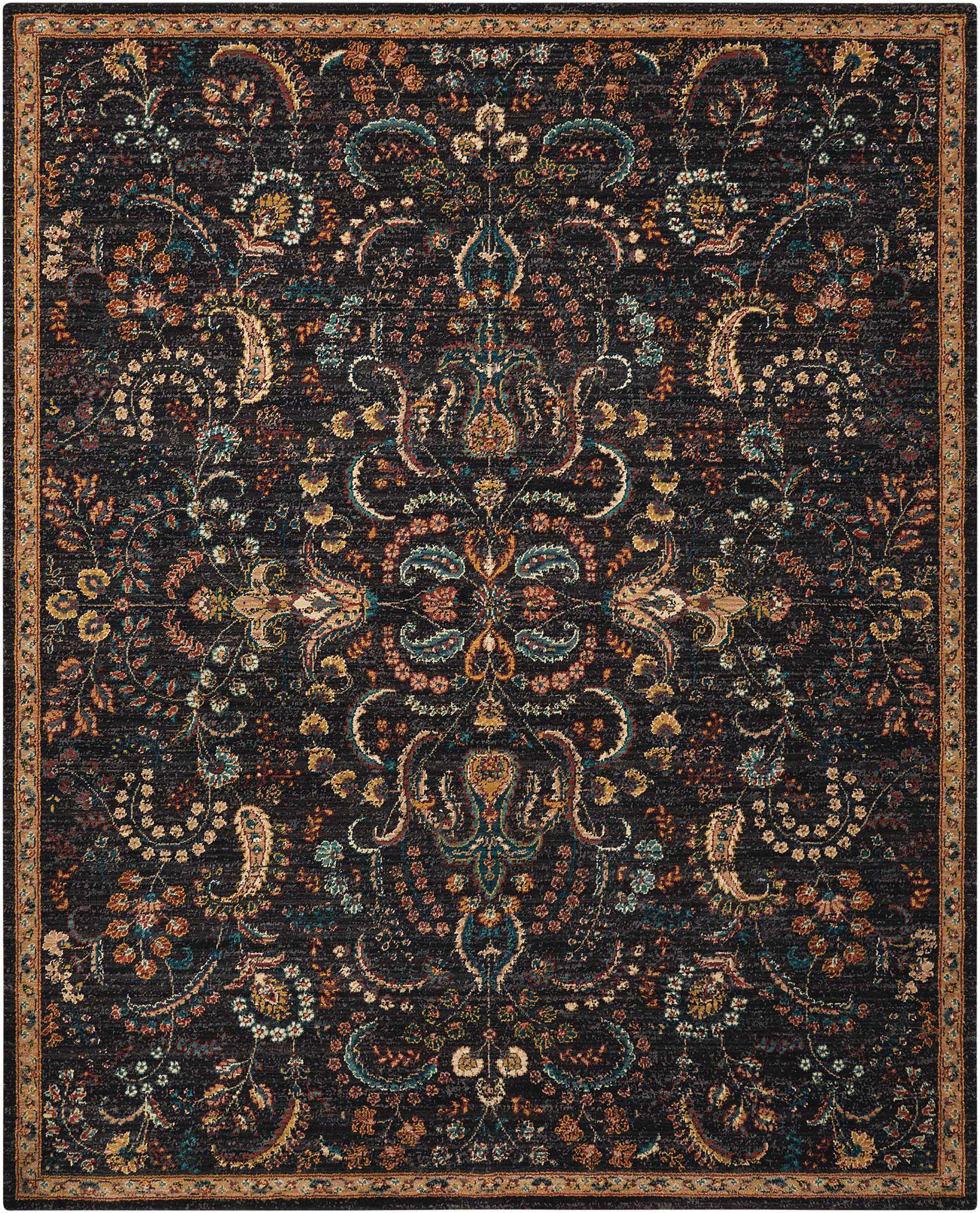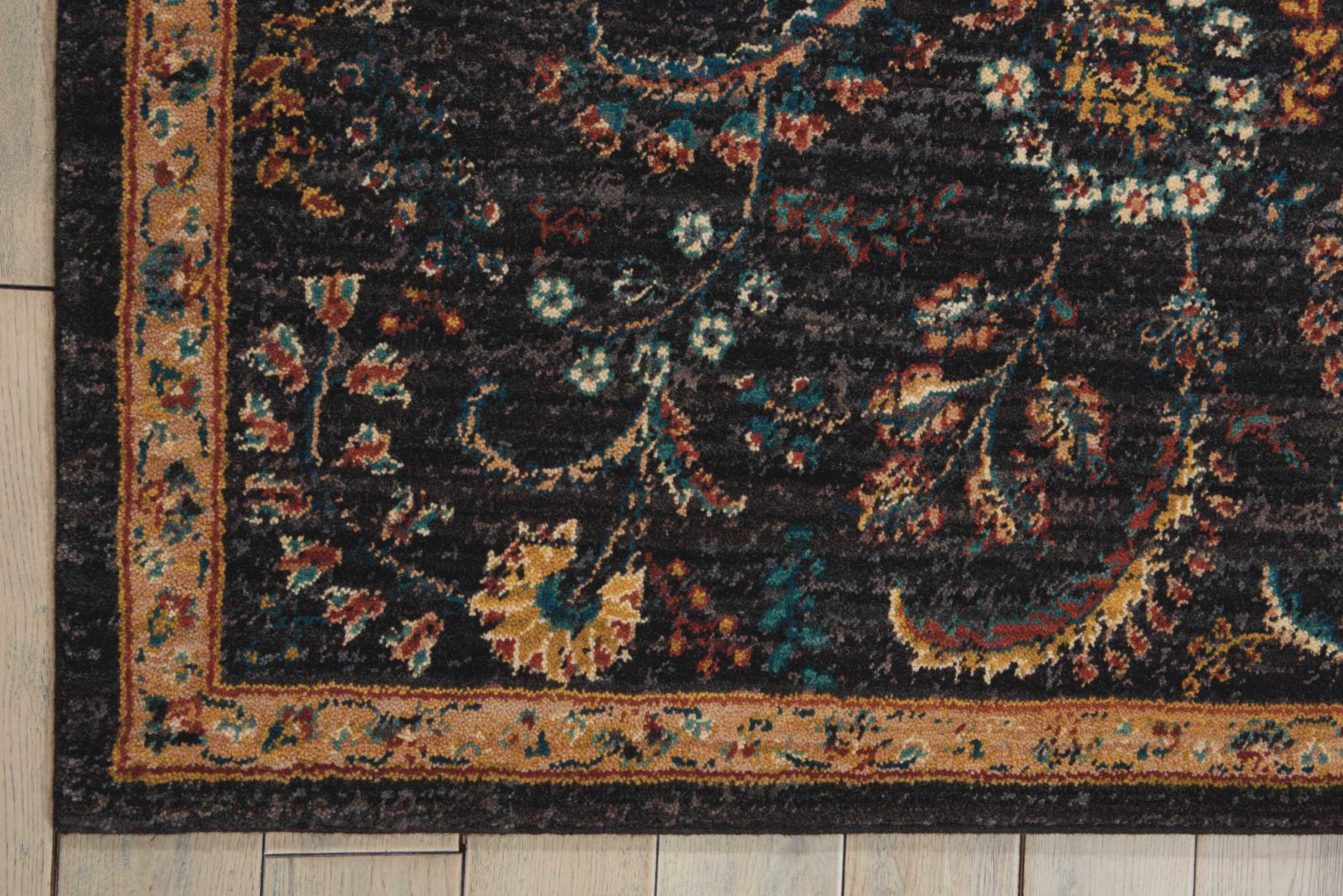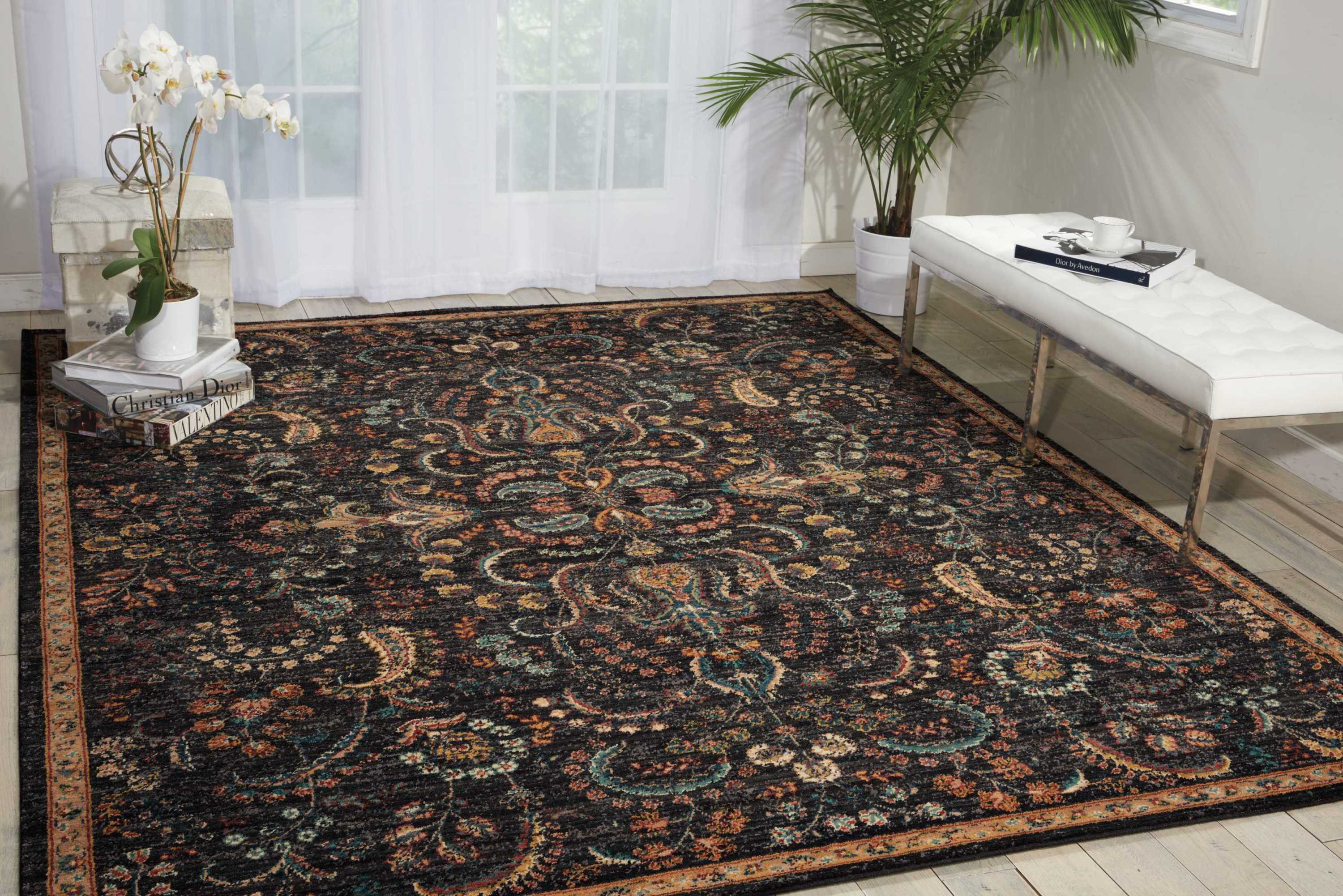A magnificent black background is artfully embellished with a delicate leaf, bloom and blossom design in luminous tones of gold, ivory, turquoise, crimson and teal. Fantastic-to-the-eye and touch, space dyed for a stupendous saturation of color, this significant Nourison 2020 area rug is superlative in its tone, texture and dimension.