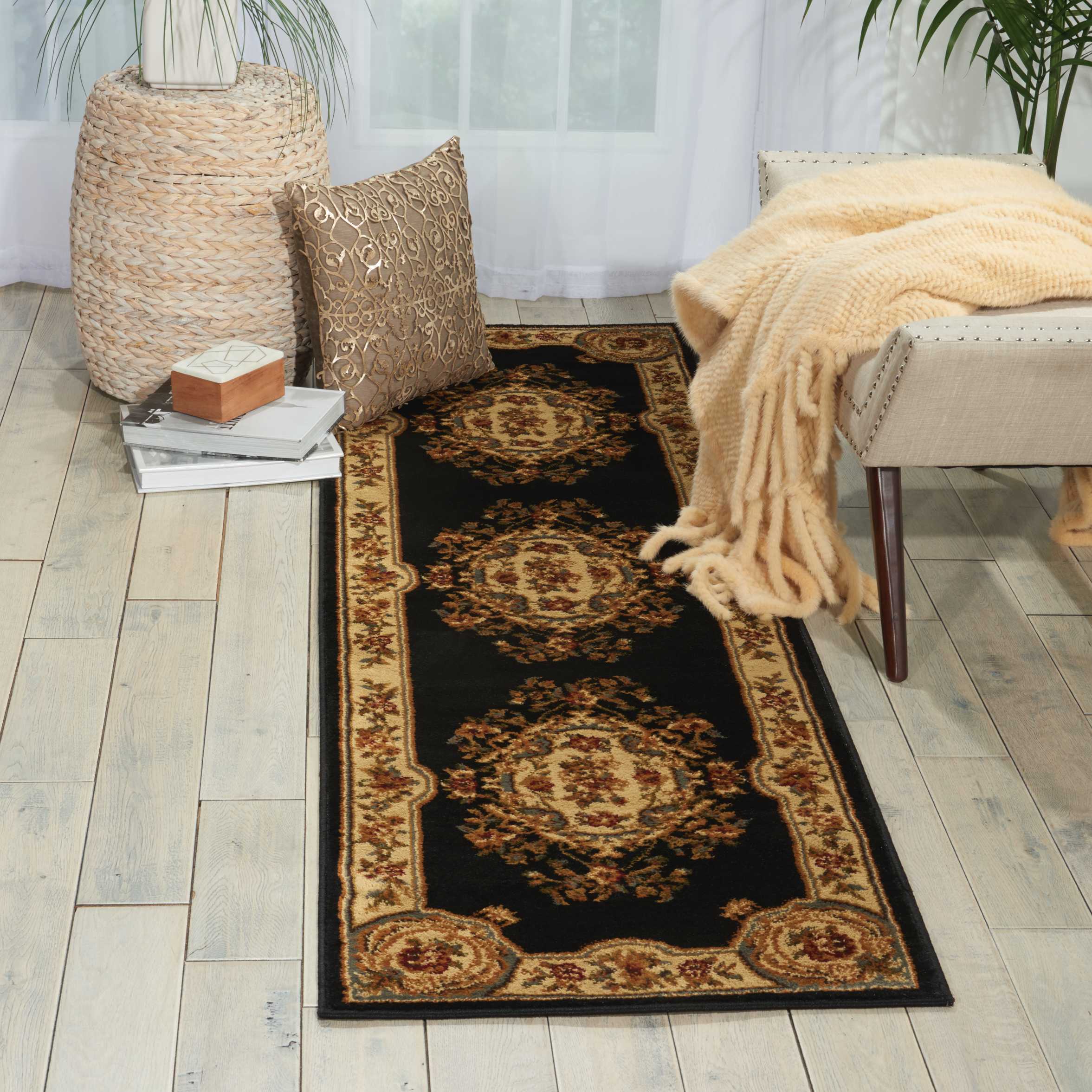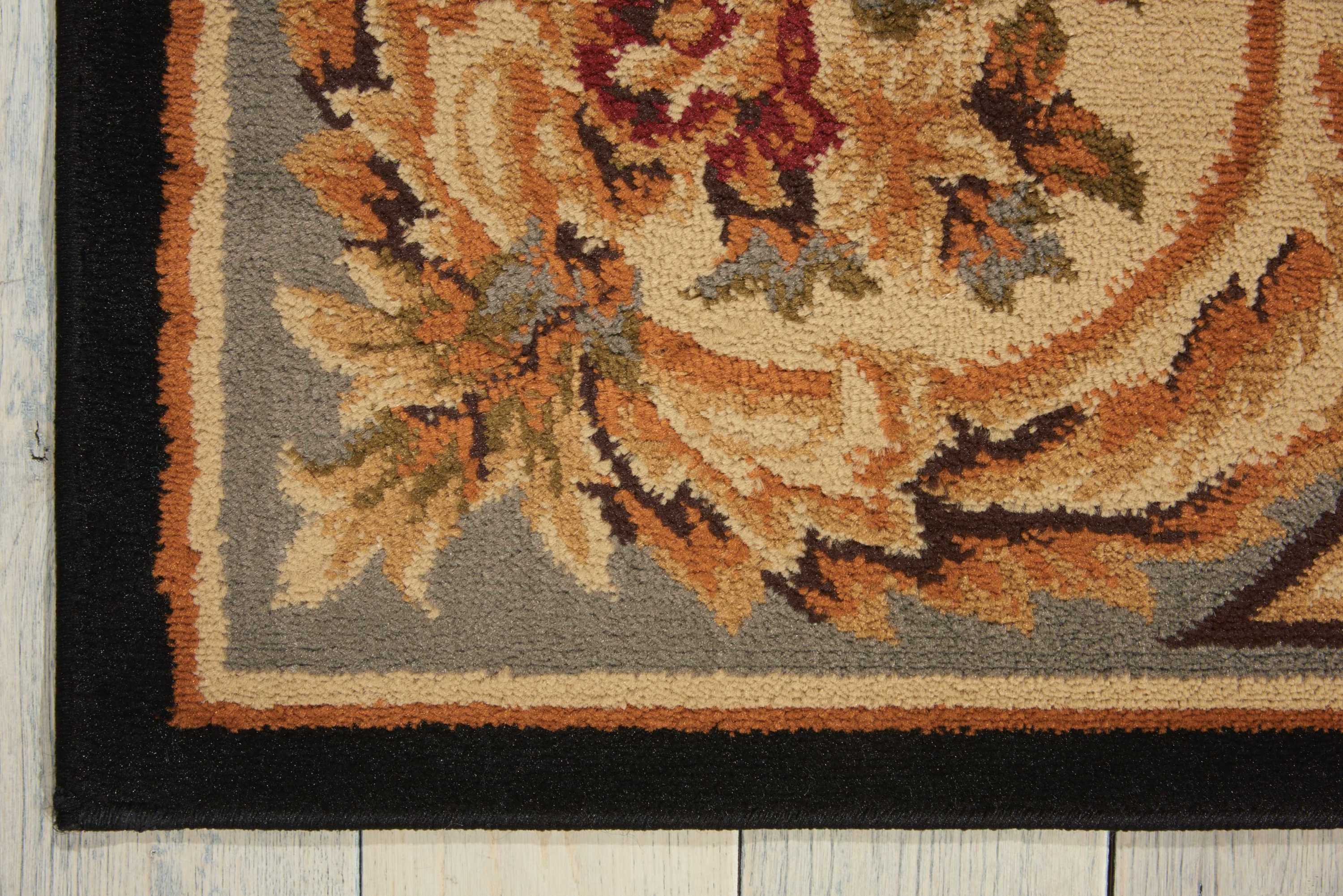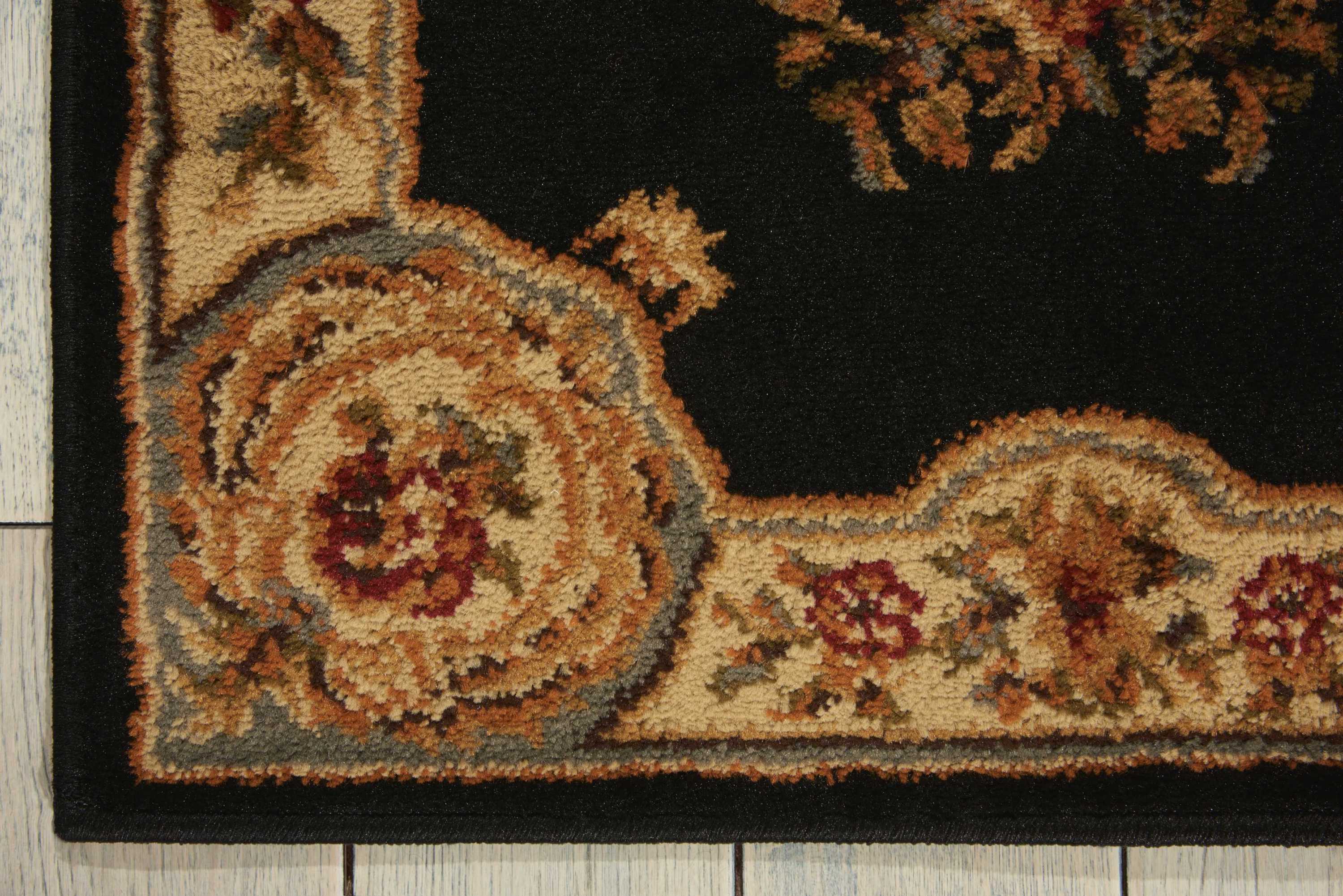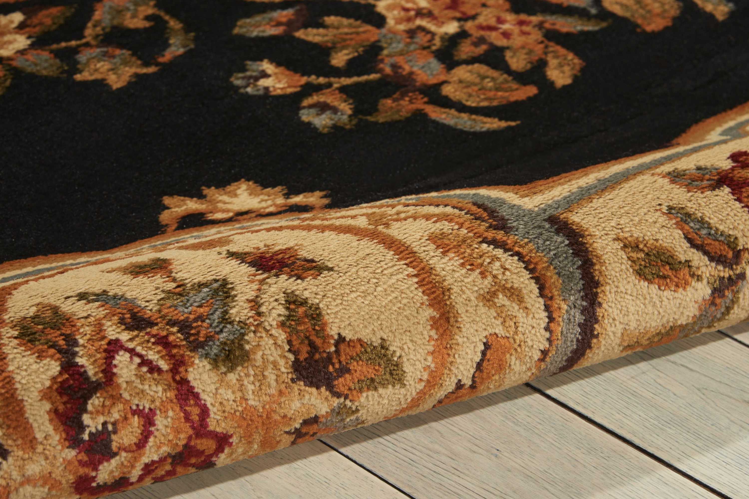 A beautifully ornate floral centerpiece rests upon an elegant black background, with borders in goldenrod and slate. Adorned with twining vines, floral embellishments, and graceful medallions, this rug is sure to add a truly remarkable air of refinement to any room.
