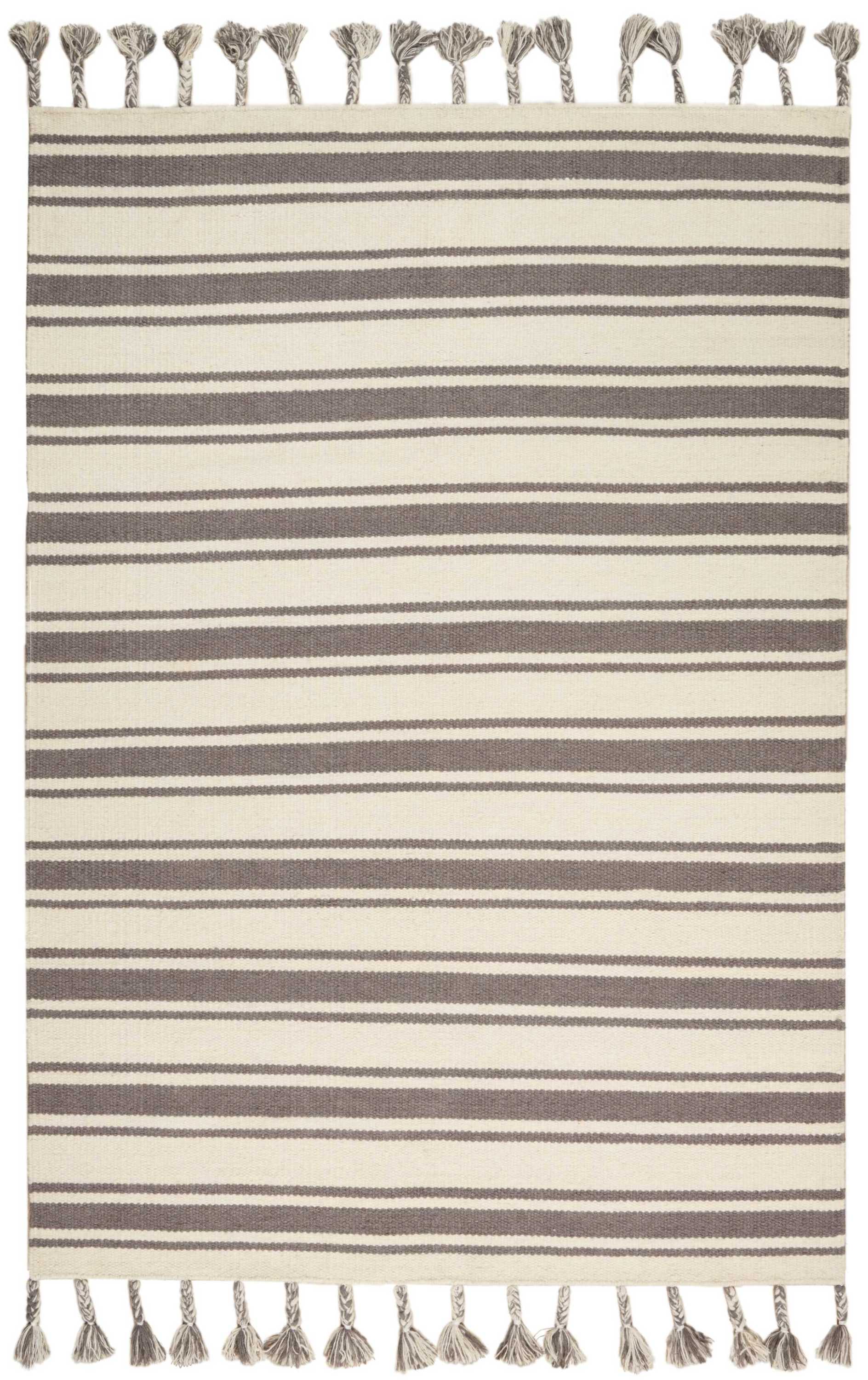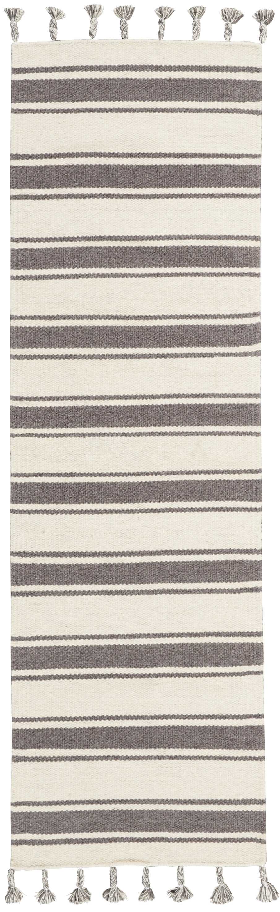 - Dhurrie weave construction in bold grey and white stripes