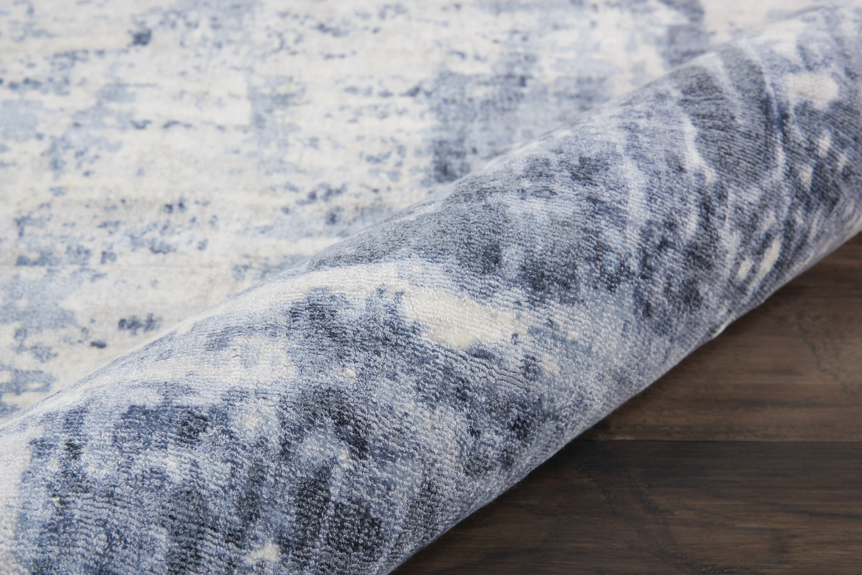 Cool shades of blue play out over the ivory field of this Safari Dreams Collection rug from kathy ireland Home, creating a beautifully distressed artistic statement. The sleek low pile and simulated brush strokes create a modern accent that sets a contemporary tone in any room in your home.
