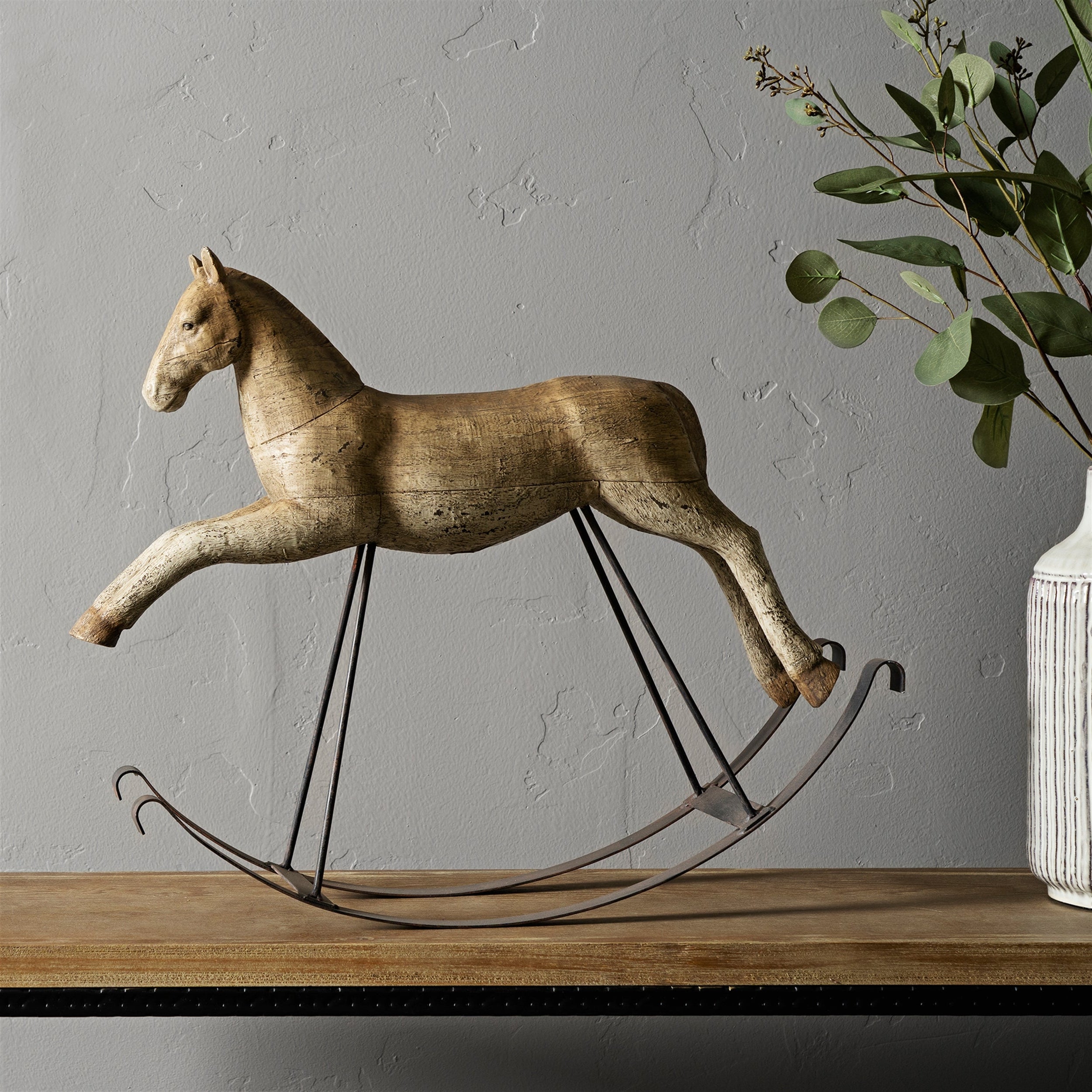 Bring timeless charm and rustic elegance to your home with the Rustic Rocking Horse Decor, measuring 22.25"L x 6.25"W x 19.25"H. Crafted from durable polyresin and lime powder, this antique-style horse features a distressed white and brown finish and sits on a sturdy metal stand. Perfect for shelves, mantels, or entryway displays, it adds nostalgic farmhouse character and a playful yet sophisticated accent to rustic, country, or vintage-inspired interiors. Ready to display, this decorative rocker enhances any space with classic charm while offering long-lasting durability. Measures 22.25 x 6.25 x 19.25"