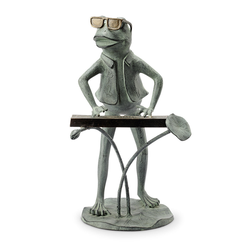 SKU - SPI34875Jazzy Keyboard Frog Garden Sculpture – 20" Tall Whimsical Metal Musician Décor, Outdoor Frog Statue with Piano
