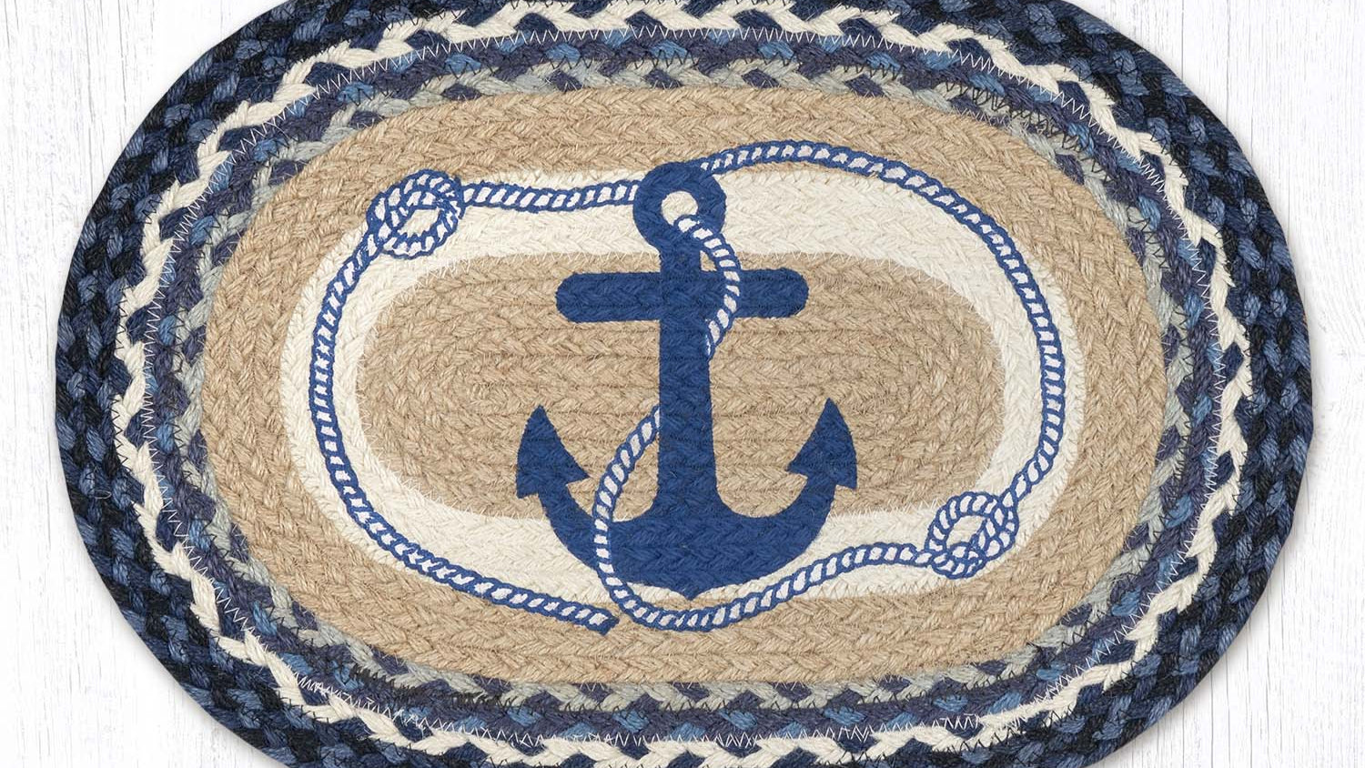 Elevate your dining experience with the Earth Rugs Anchor Oval Placemat in navy. Measuring 13"x19", this nautical-themed accent adds a refined touch to any table setting. Crafted for durability and style, its rich navy tone and anchor design create a coastal ambiance while protecting surfaces from spills and scratches. Ideal for both everyday meals and special occasions, this placemat blends functionality with classic nautical charm.