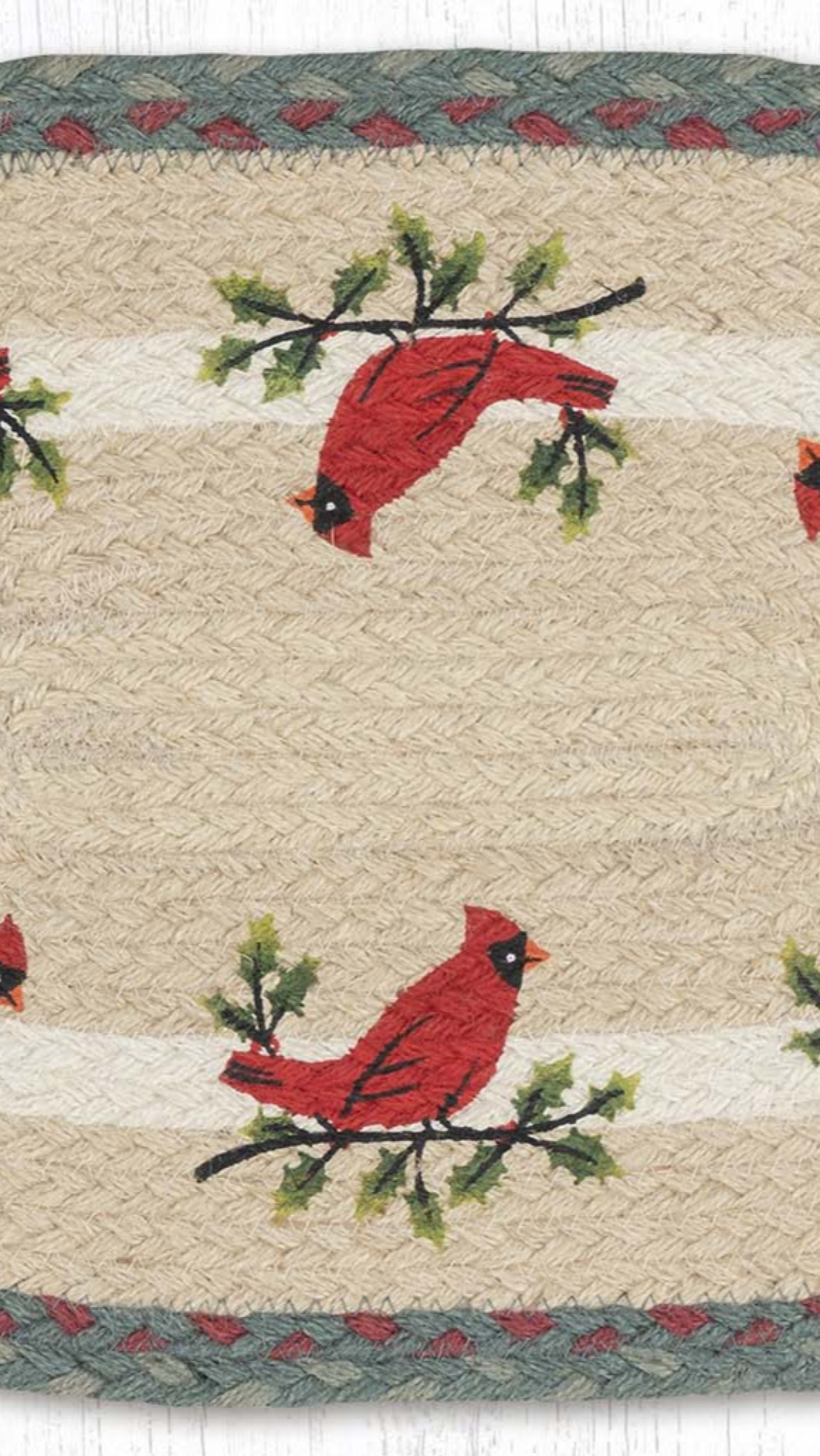 braided jute placemat,cardinal table decor,Christmas dining room accessory,country Christmas style,decorative oval table mat,Earth Rugs holiday collection,eco-friendly holiday decor,farmhouse holiday accents,farmhouse placemat,festive table setting,handmade jute decor,holiday placemat,oval placemat Christmas,Placemats,rustic Christmas dining,rustic holiday kitchen