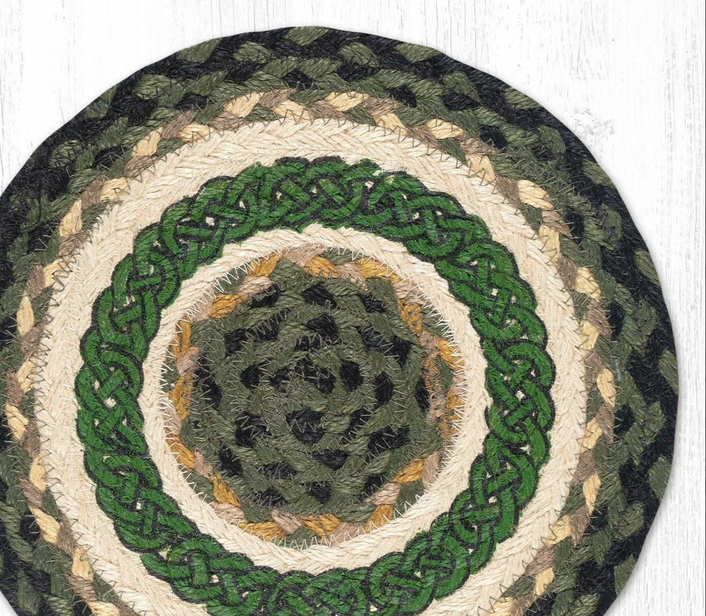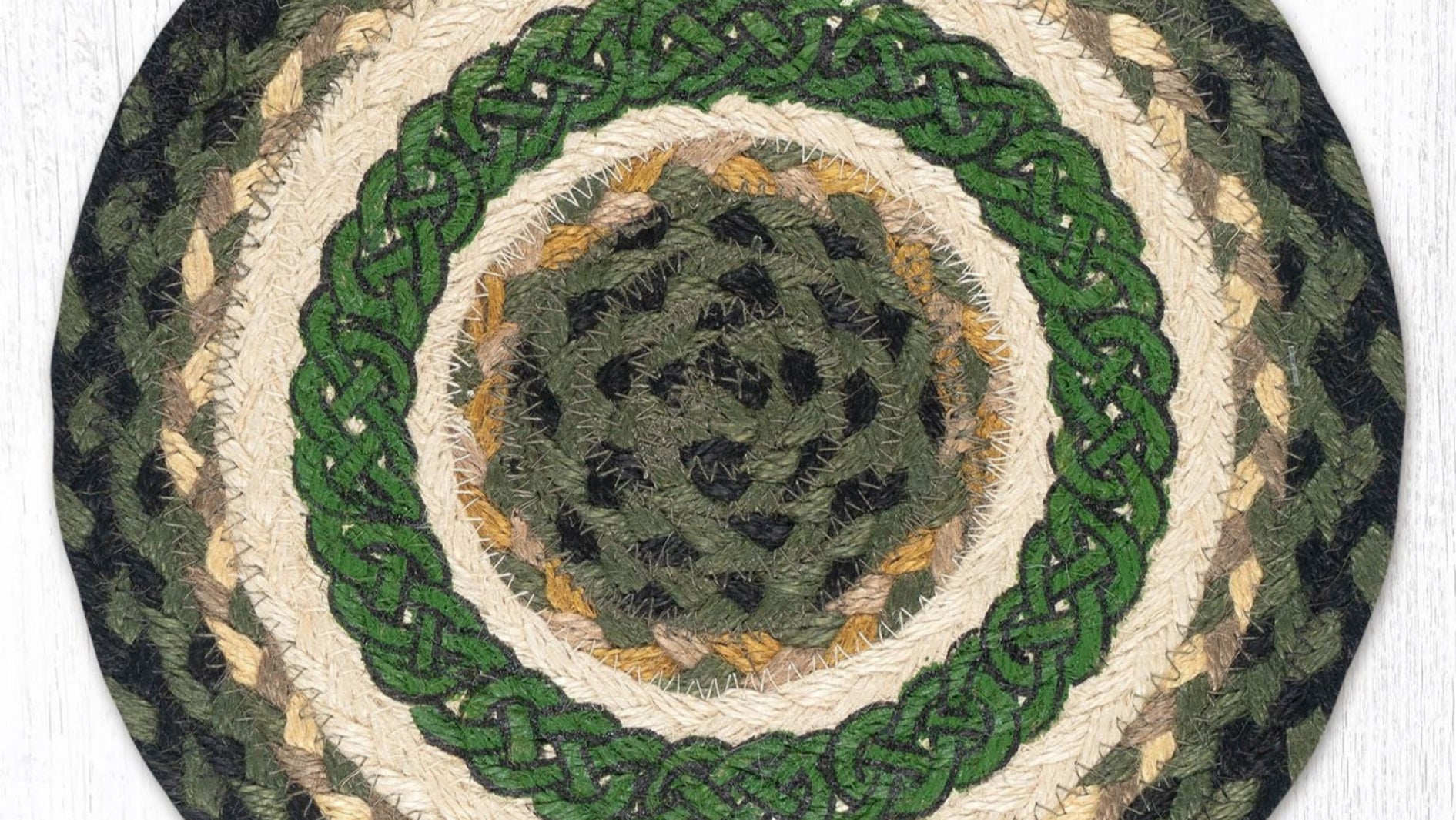 Celebrate timeless tradition with the Earth Rugs Irish Knot Printed Round Trivet, a functional and artistic accent for your home. Crafted from 100% natural braided jute, this 10" x 10" round trivet features an intricate Irish Celtic knot print at the center — a symbol of unity, eternity, and cultural pride. Its earthy tones and rich symbolism make it an elegant addition to dining tables, kitchen counters, or spiritual spaces. Whether used to protect surfaces from hot cookware or as a decorative piece with heritage flair, this trivet brings meaningful design and eco-conscious quality into your space.