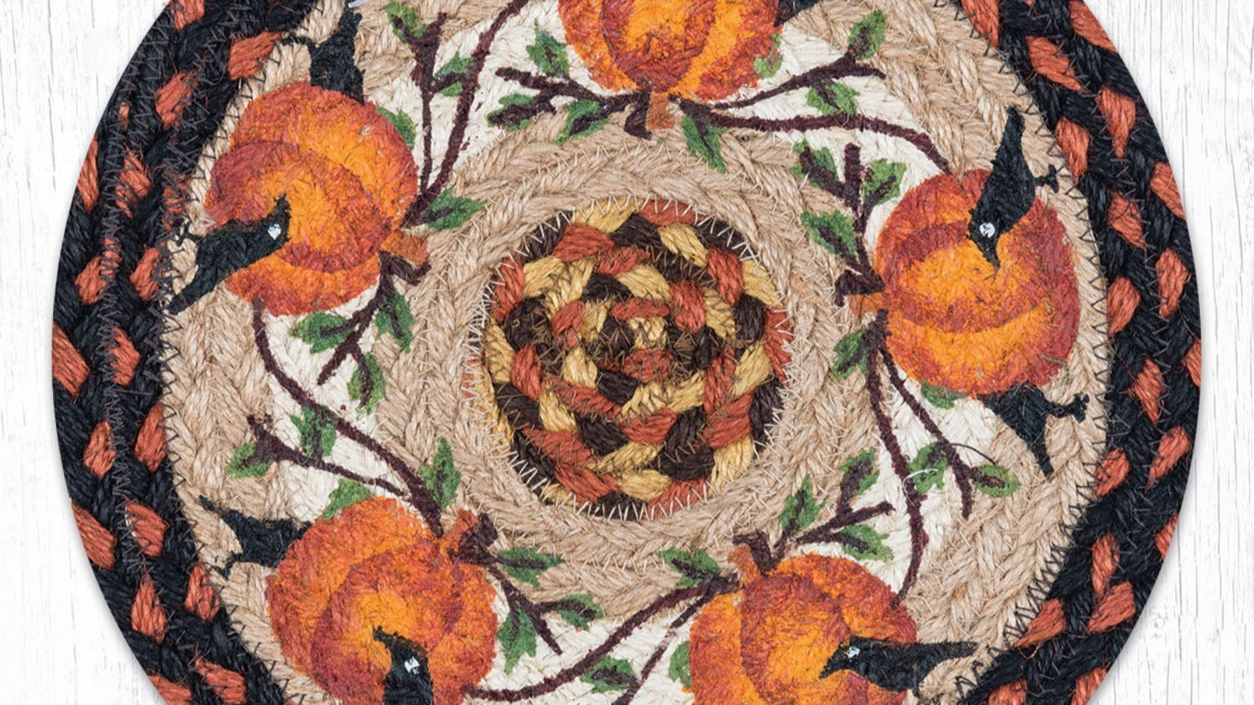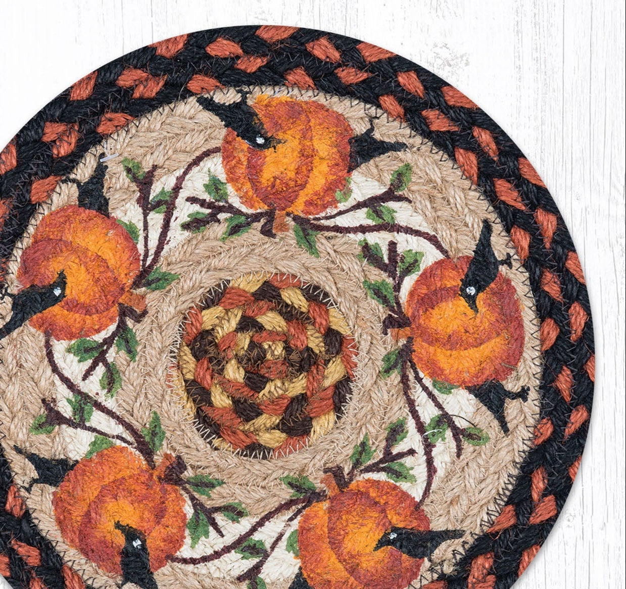 SKU - ER80-222PCPumpkin Crow Printed Round Trivet – 10"x10" Braided Jute Autumn Hot Pad with Primitive Folk Art Harvest Design