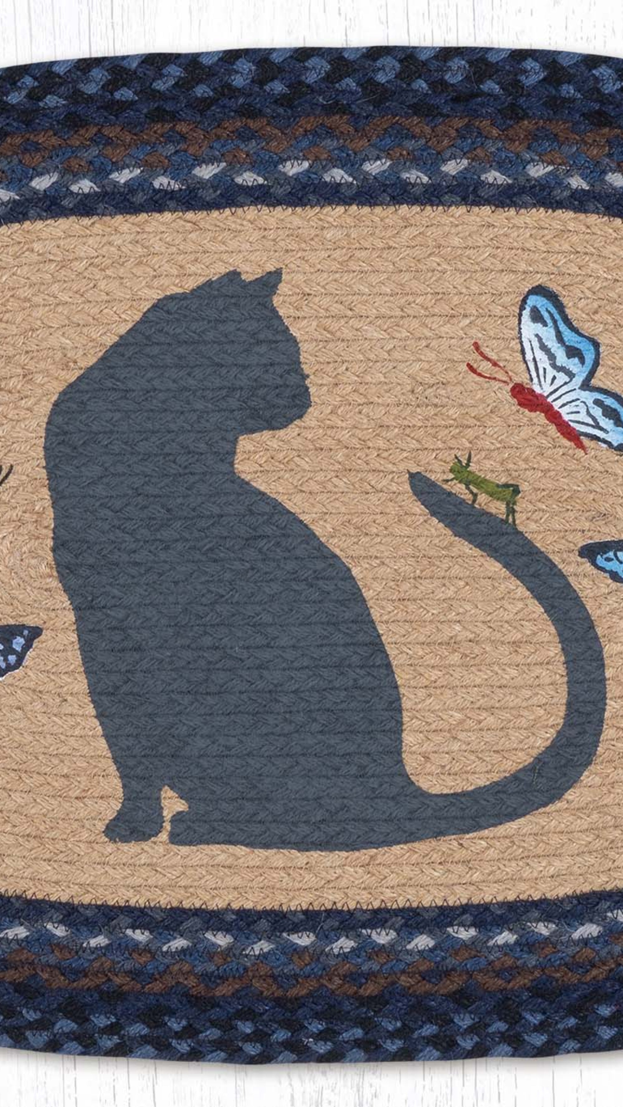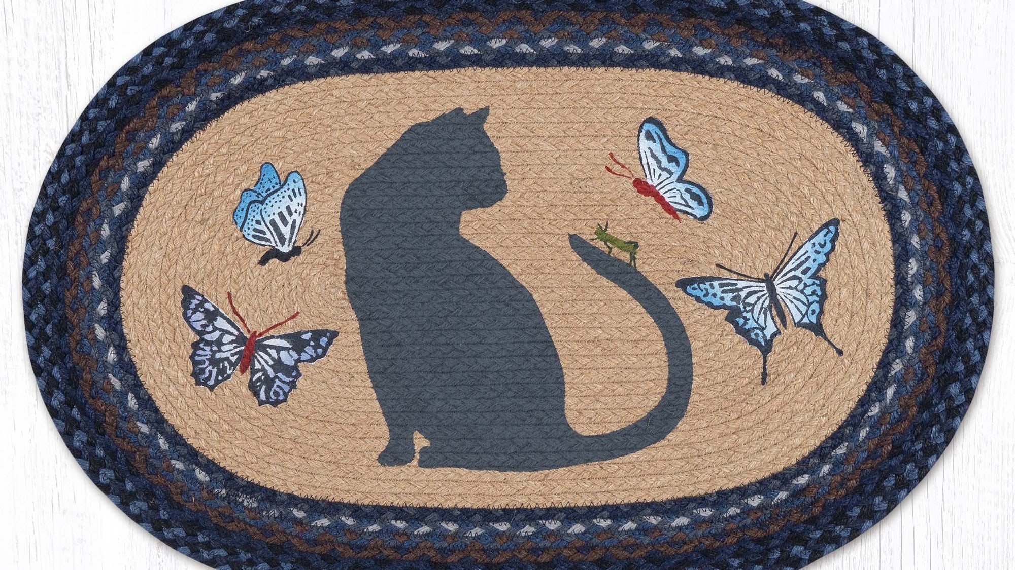 Earth Rugs Cat and Grasshopper Oval Jute Tread – 20"x30", Nature-Inspired Hand-Stenciled Patch