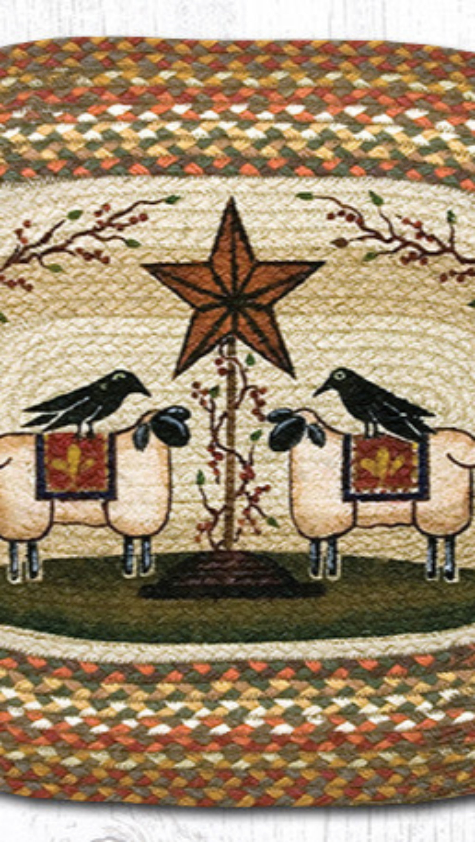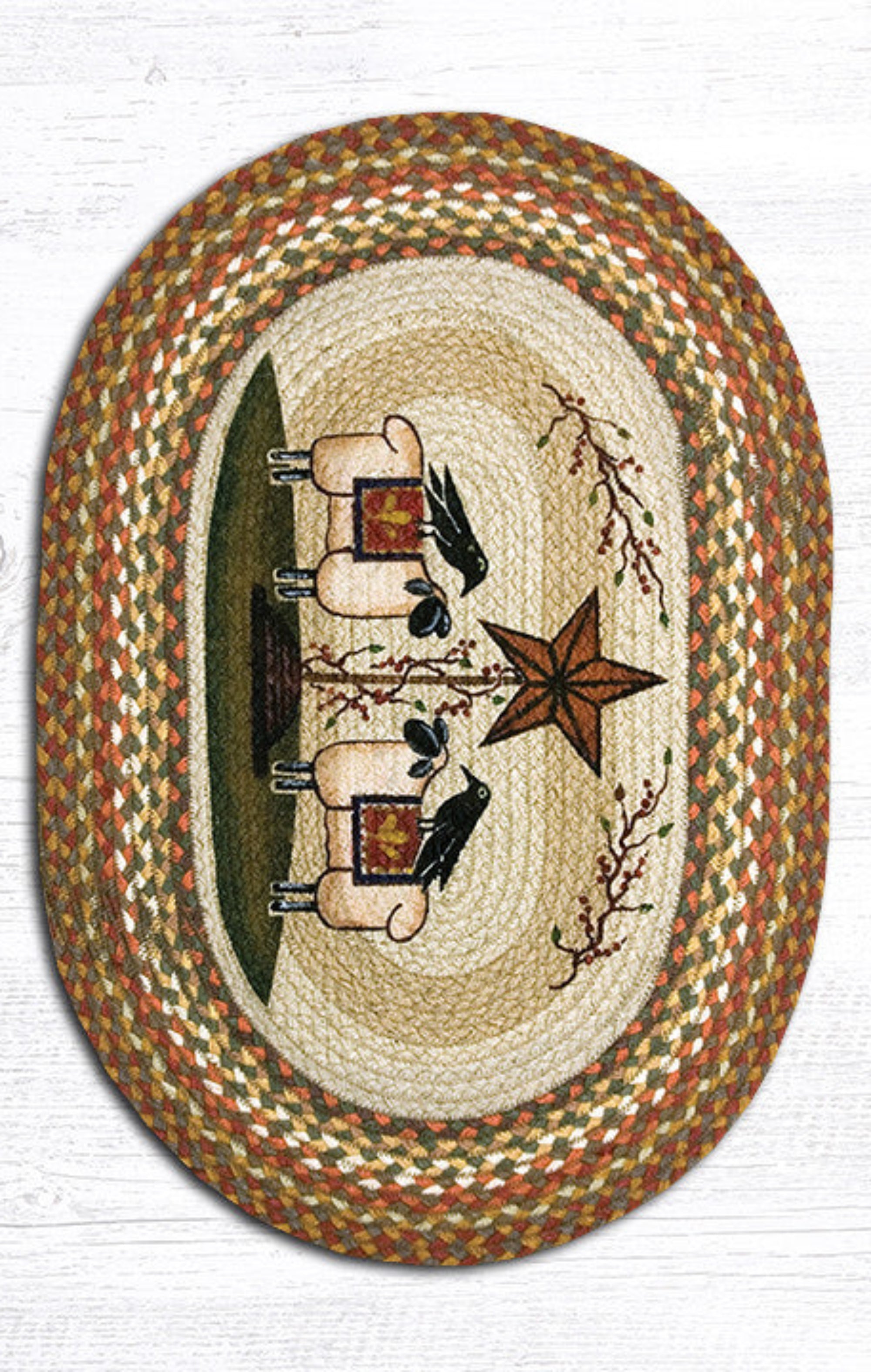 20x30 entryway runner,cabin rustic rug,Earth Rugs,eco-friendly entryway rug,farmhouse oval patch,hand-braided jute rug,hand-braided oval jute rug,oval jute runner,Placemat,primitive farmhouse rug,rustic country jute rug,rustic farmhouse décor rug,sheep & barn star oval rug,sheep and barn motif rug,small hallway rug,small oval rug 20x30,Uber Living,Under $100