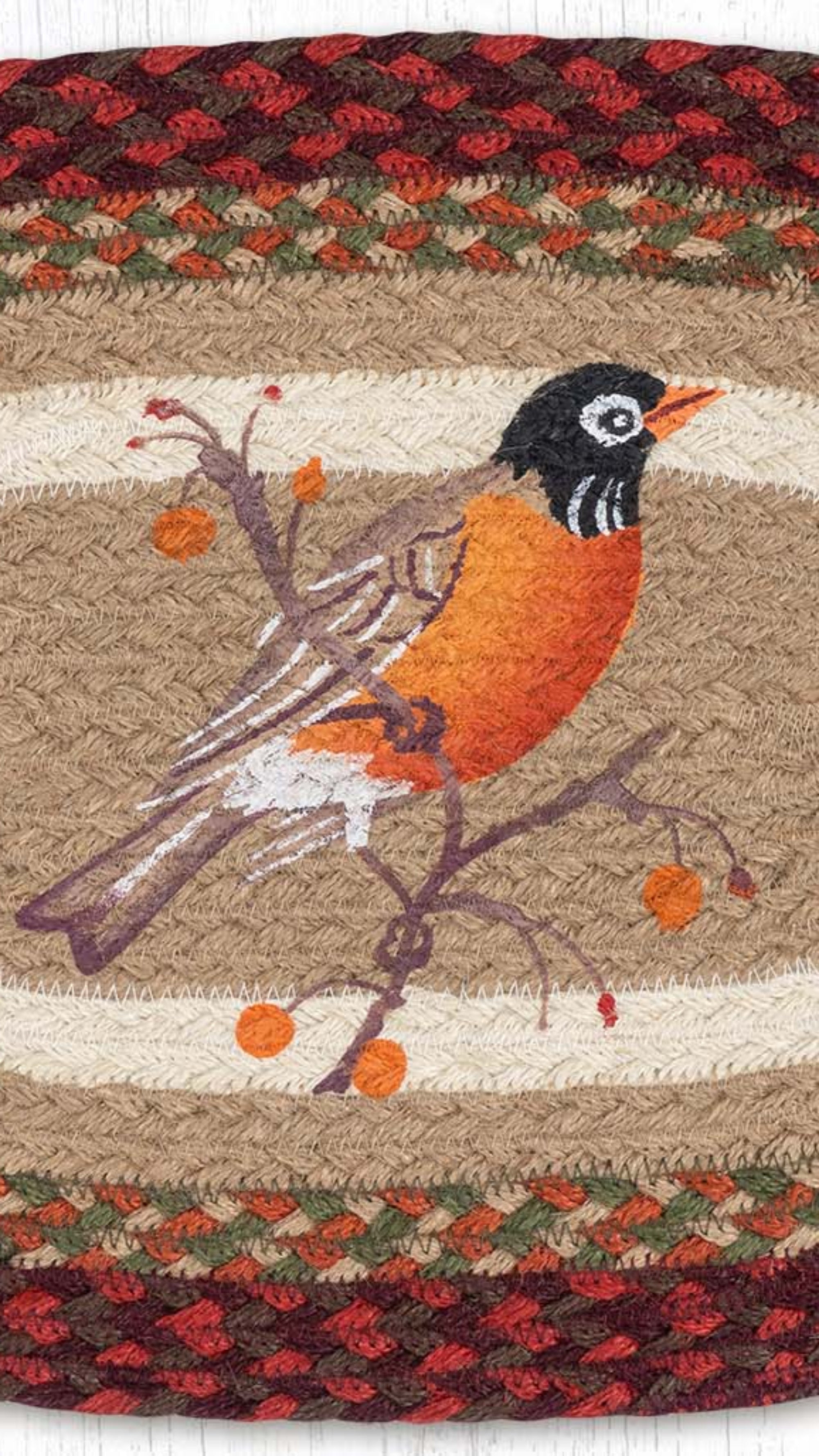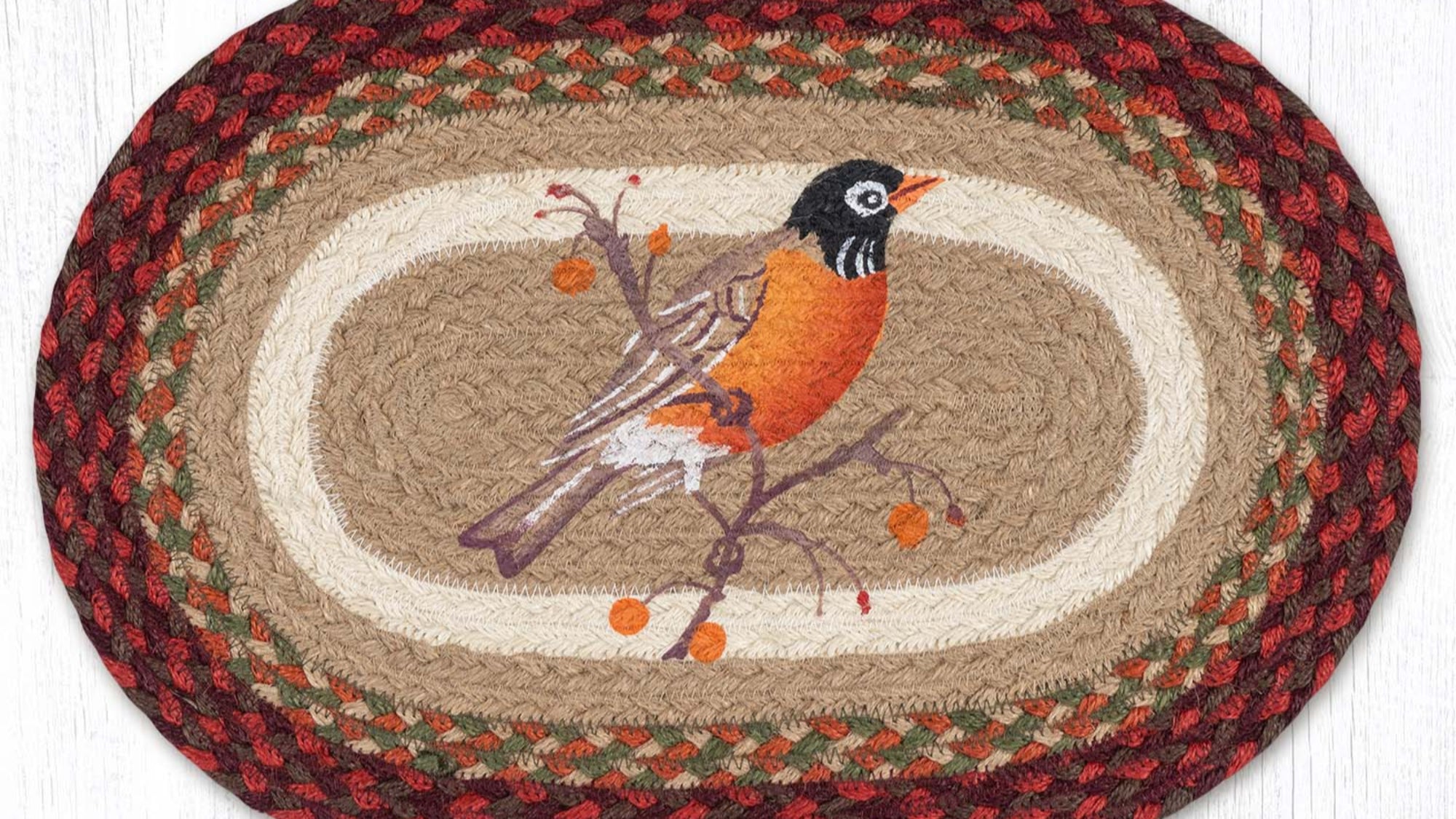 13x19 oval jute placemat,bird print table mat,braided jute placemat,country kitchen table accent,Earth Rugs robin table decor,eco-friendly jute placemat,farmhouse bird table mat,handmade oval placemat,lodge style dining placemat,Placemat,Robin oval placemat,rustic cabin table setting,rustic oval dining placemat