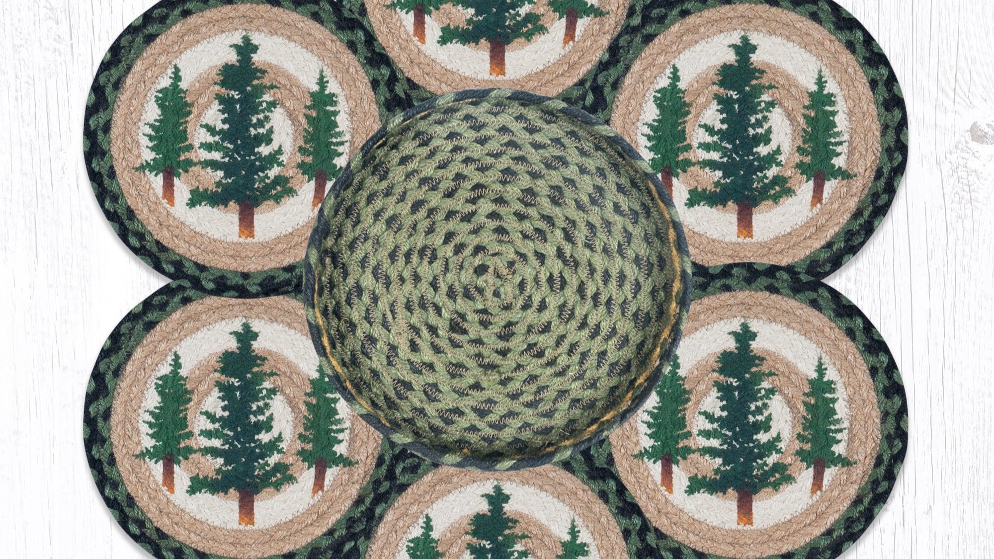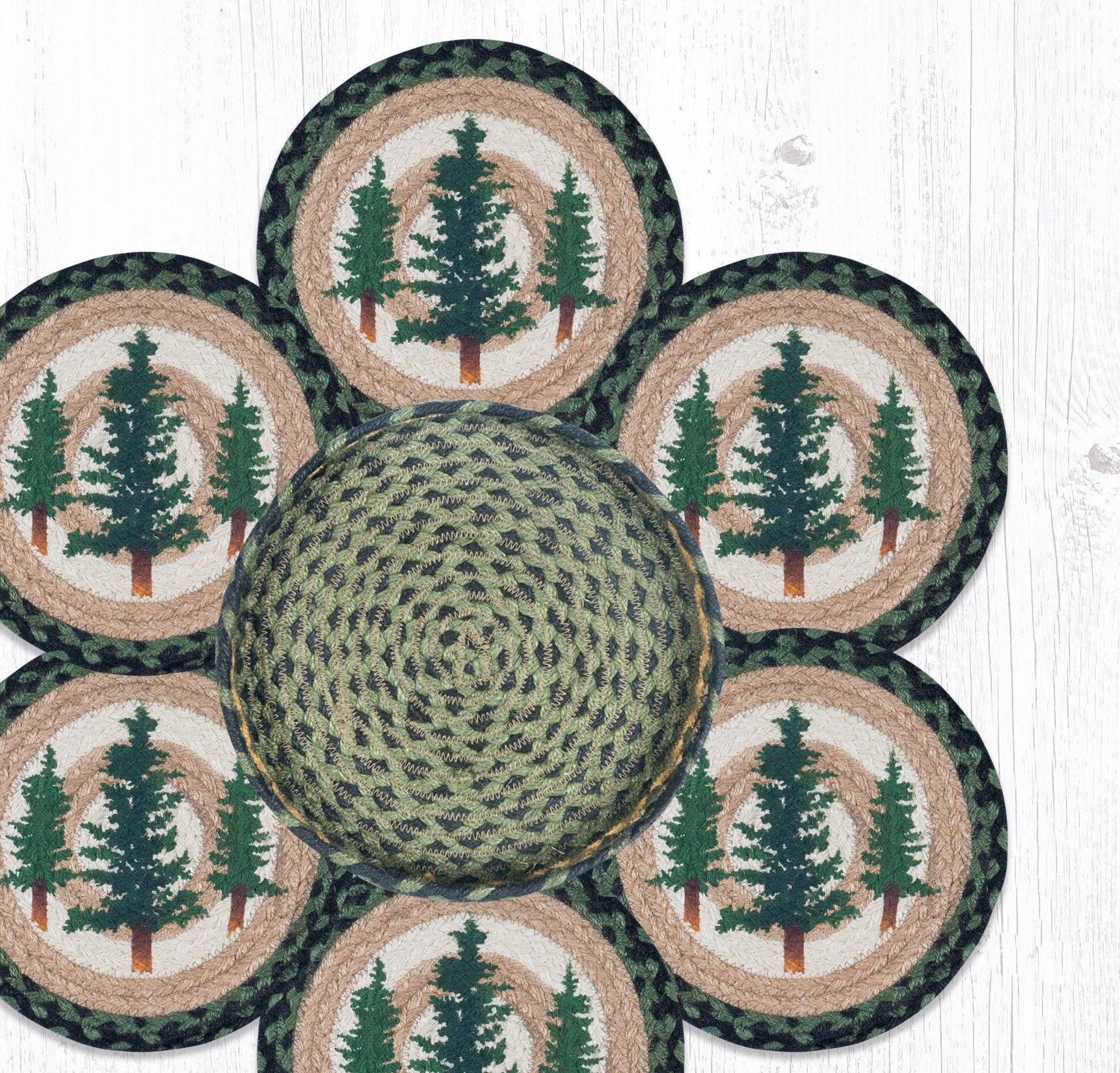 Bring the peace of the forest into your home with the Earth Rugs Tall Timbers Trivets in a Basket. This 10" x 10" round braided jute trivets, each featuring a beautifully printed tall pine tree motif, bundled neatly in a coordinating woven jute basket. Crafted from 100% eco-friendly jute, these trivets are as functional as they are decorative—ideal for rustic kitchens, lodge settings, or cabin-inspired homes. Protect your surfaces while displaying a cohesive woodland theme. Each trivet showcases rich earth tones and forest silhouettes, making this set both a practical and aesthetic gift option.