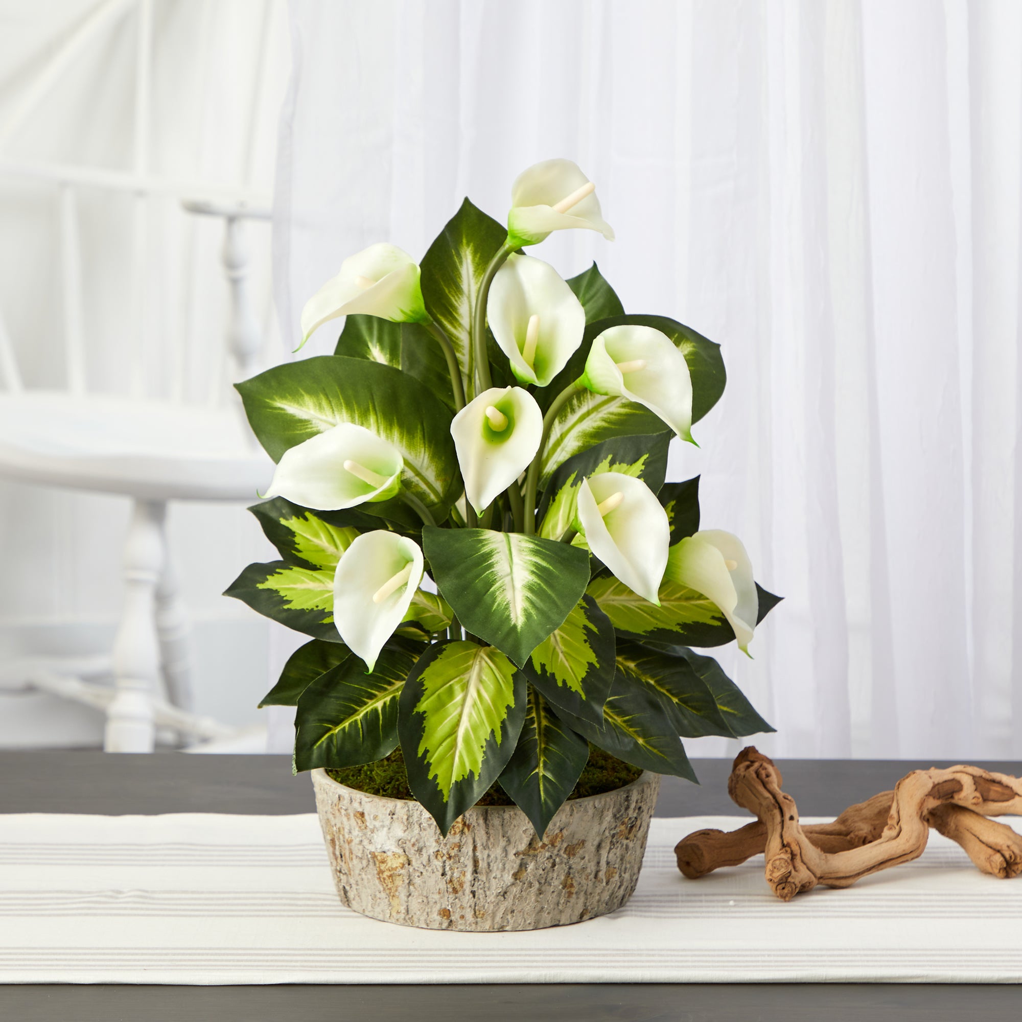 Nearly Natural 19``Calla Lily and Golden Dieffenbachia Artificial Plant in Weathered Oak Planter