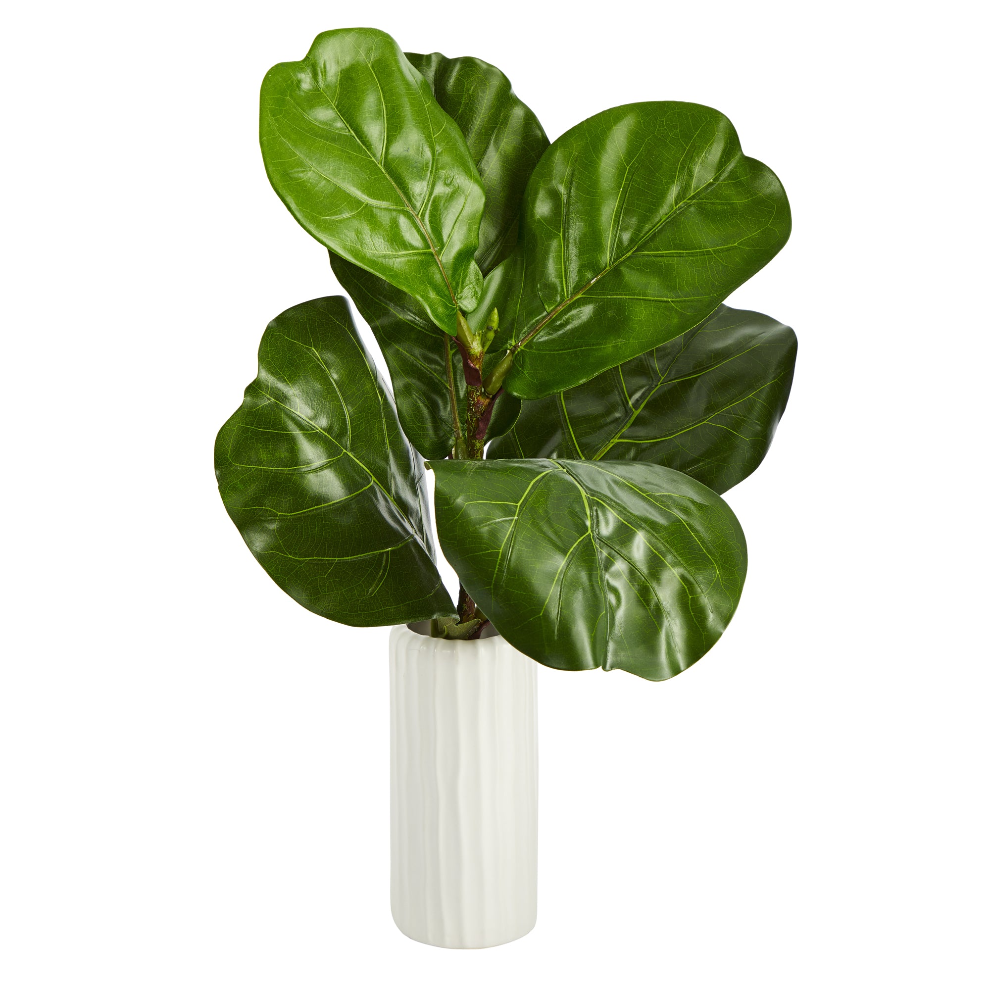 Brighten up a bare space in your home or office with this vibrant artificial plant designed with oversized fiddle leaf fig leaves in glossy, verdant hues that look incredibly lifelike. A year-round (faux) favorite amongst interior decorators, this artificial fiddle leaf fig plant stands 20`` high from a white planter and would easily provide year-round freshness to any space it inhabits.