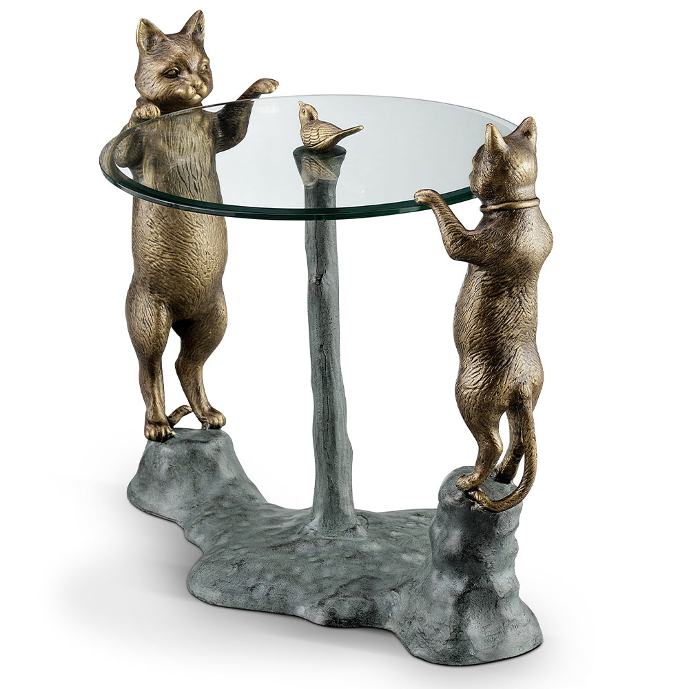 SKU - SPI35165Curious Cats End Table – Aluminum Sculptural Side Table with Glass Top, Whimsical Feline Design for Cat Lovers