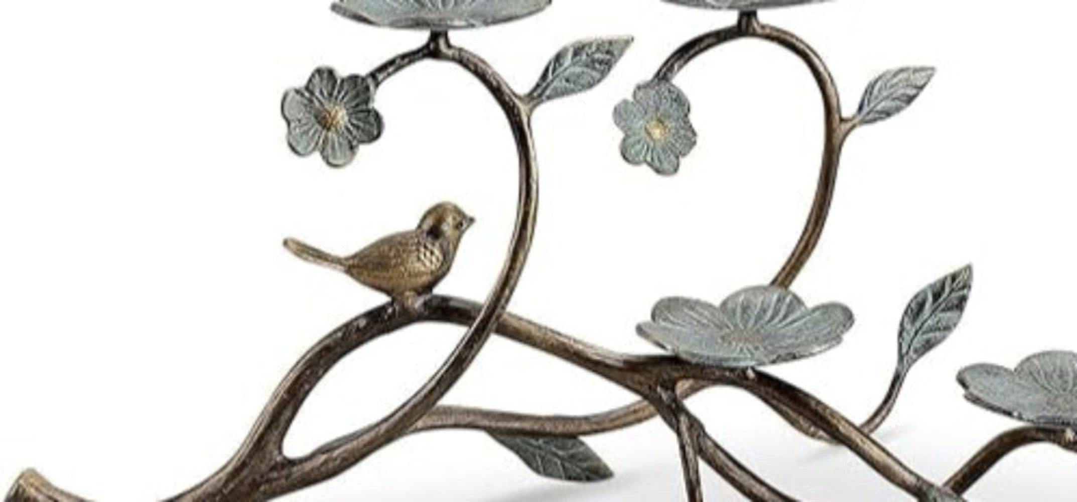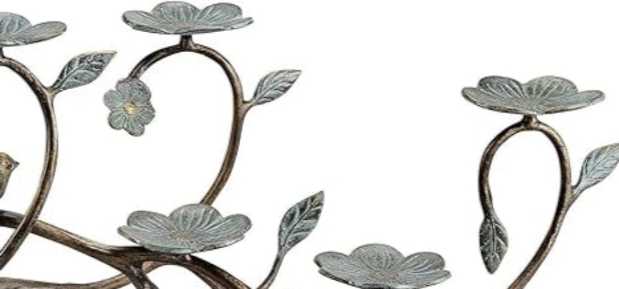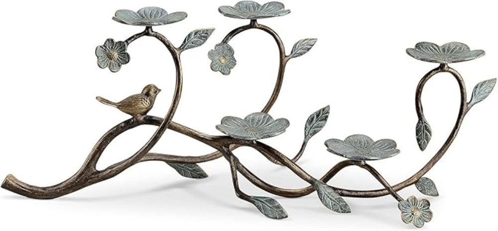SPI Home Distressed Grey Bird and Flowers Aluminum Candelabra Holder – 25" x 9.5" Nature-Inspired Centerpiece
