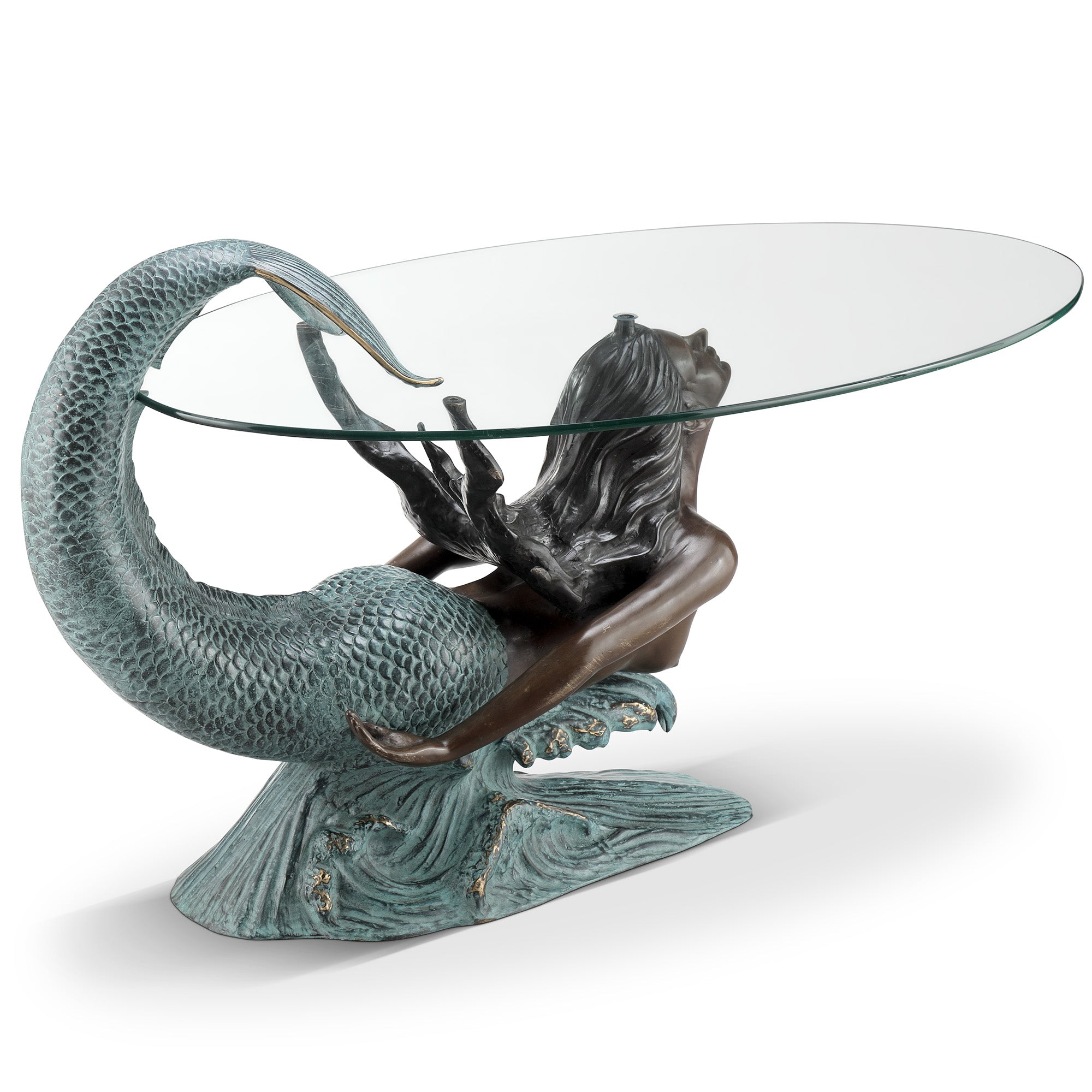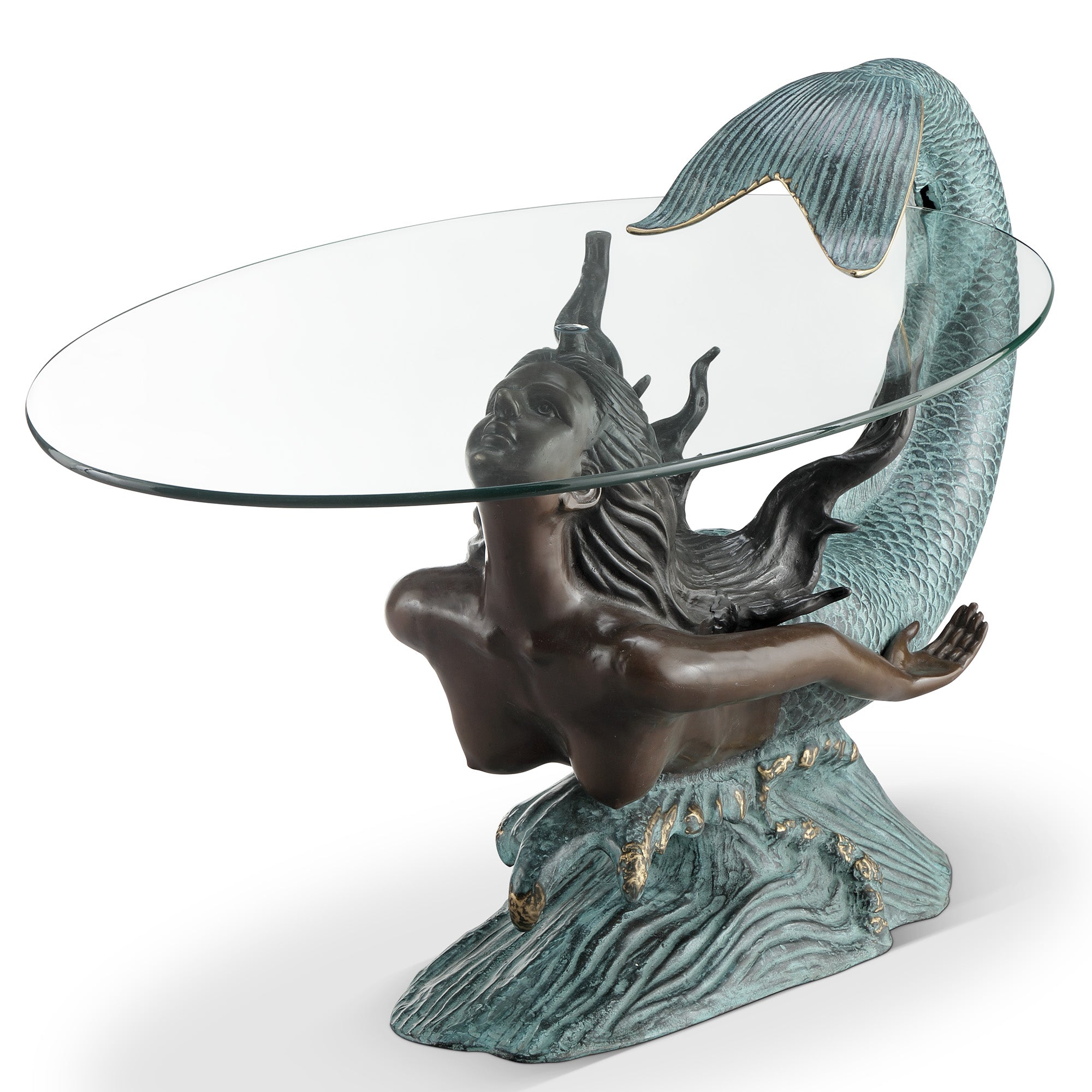 - Sculptural mermaid base in dynamic diving pose.