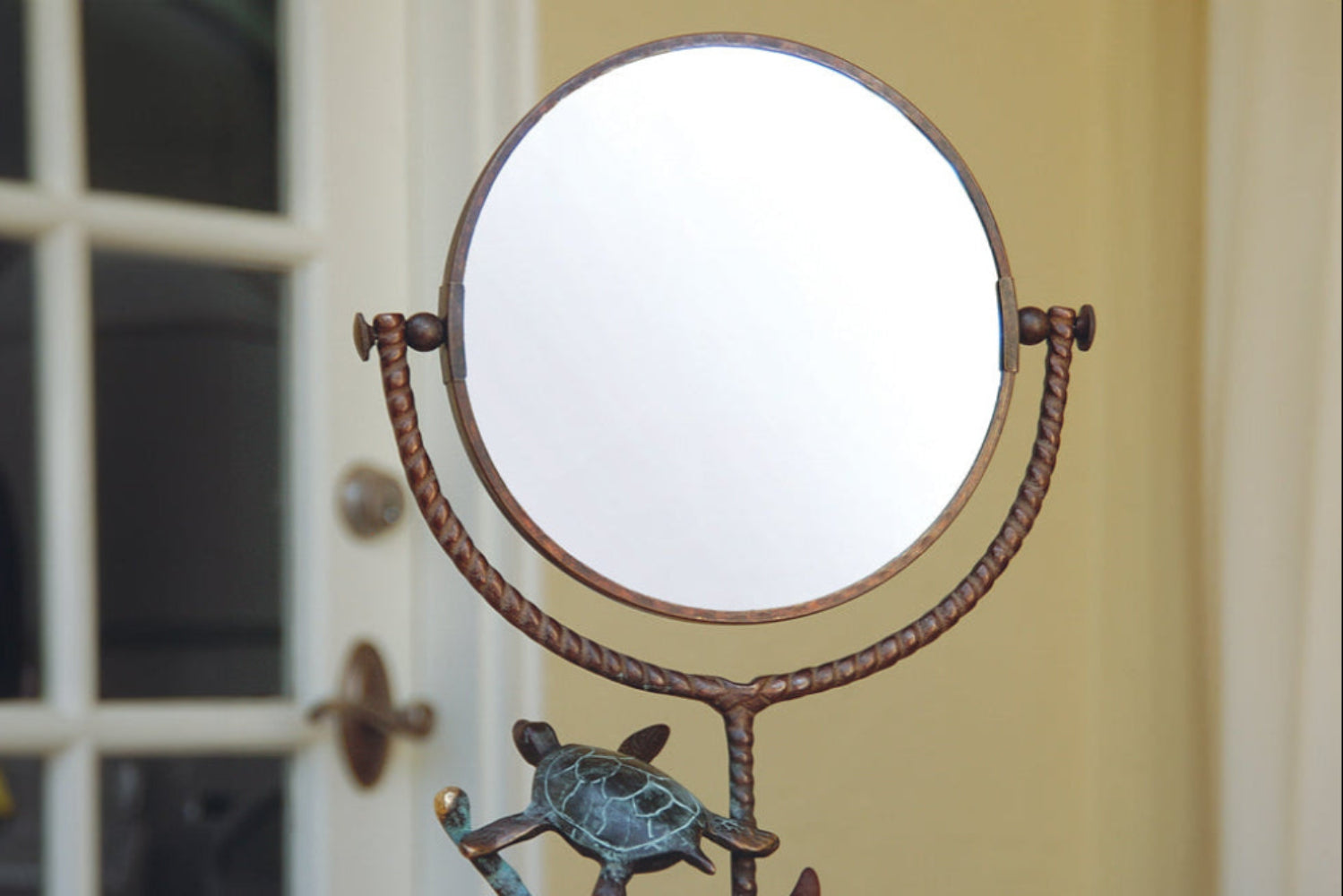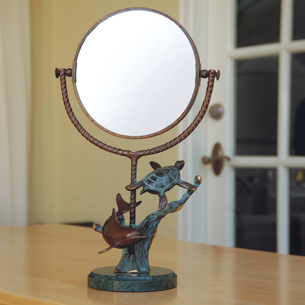 Add an elegant oceanic touch to your vanity or tabletop with the Dolphin and Turtle Mirror by SPI Home. This finely crafted accent piece features a circular mirror framed by a sculptural brass dolphin and sea turtle, gracefully posed above a polished marble base. The design evokes a tranquil underwater scene, combining marine life beauty with practical use. Standing 15 inches tall and measuring 11 inches wide by 5 inches deep, this mirror blends function and artistry—perfect for bathrooms, dressers, or beach-inspired interiors.