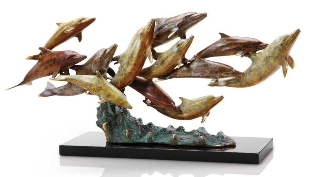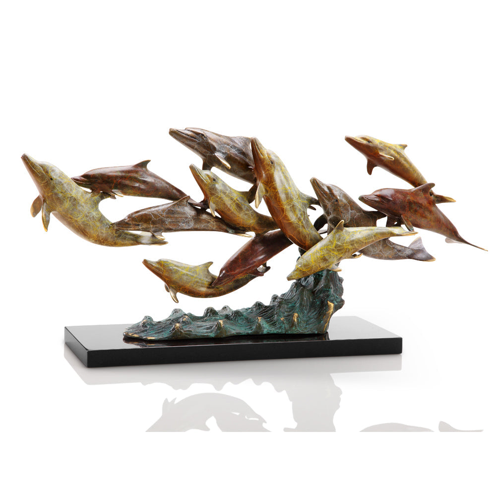 SKU - SPI80266Dozen Swimming Dolphins Brass Sculpture – Flowing Marine Art Accent, 20" Wide Ocean Display