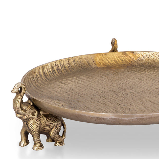 Bring a touch of exotic charm and artisanal flair to your tabletop with the SPI Home Elephant Trio Tray. Crafted in cast aluminum, this 4.5-inch tall tray features three intricately sculpted elephants working together to support a shallow, leaf-shaped bowl. With a width of 15 inches and a length of 14 inches, it's ideal for holding small décor accents, wrapped treats, keys, or jewelry. The tray's polished metallic finish and detailed elephant figures make it a standout piece for entry tables, coffee tables, or vanities, while adding a hint of global style and storytelling to any space