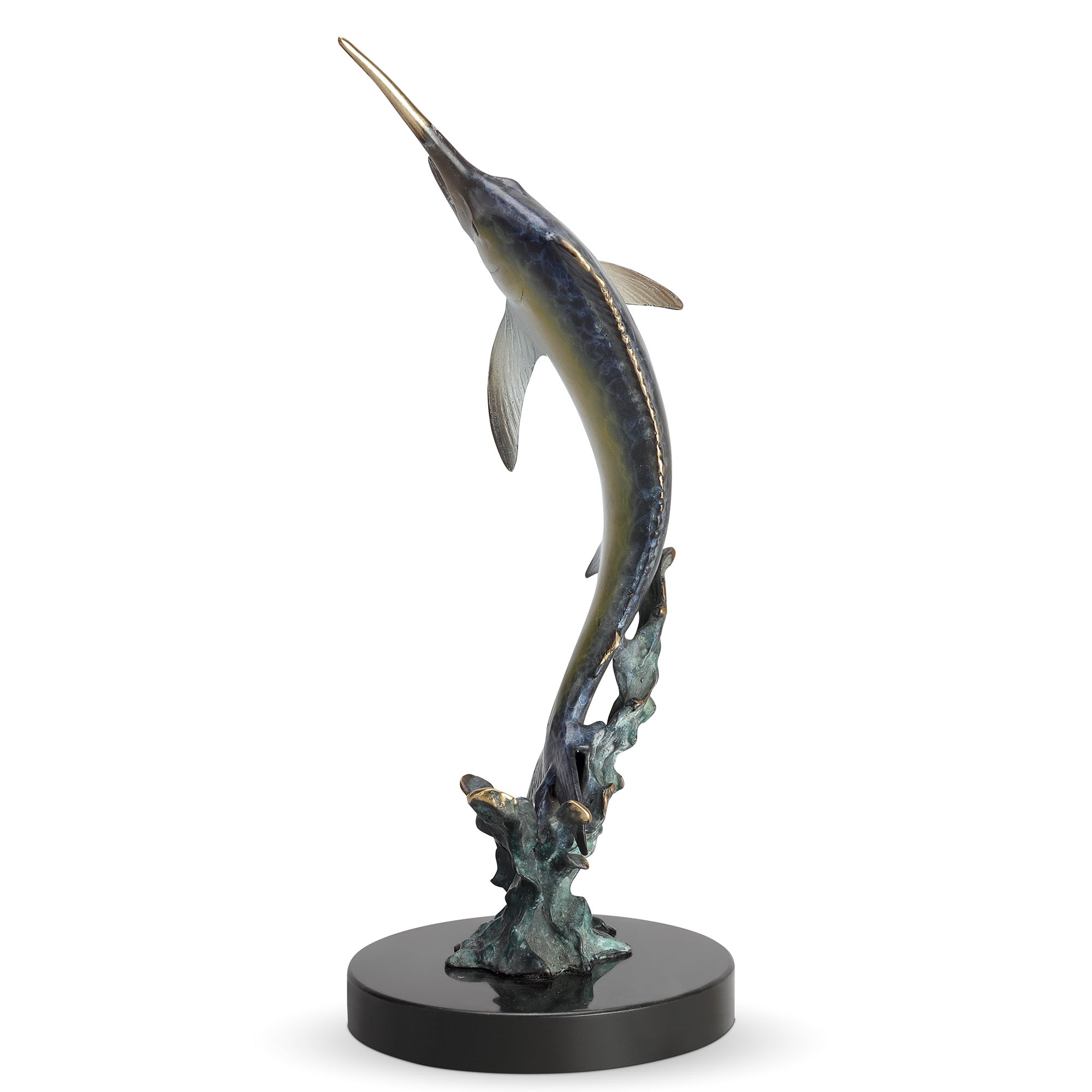 - Dynamic marlin pose captures ocean energy and motion.