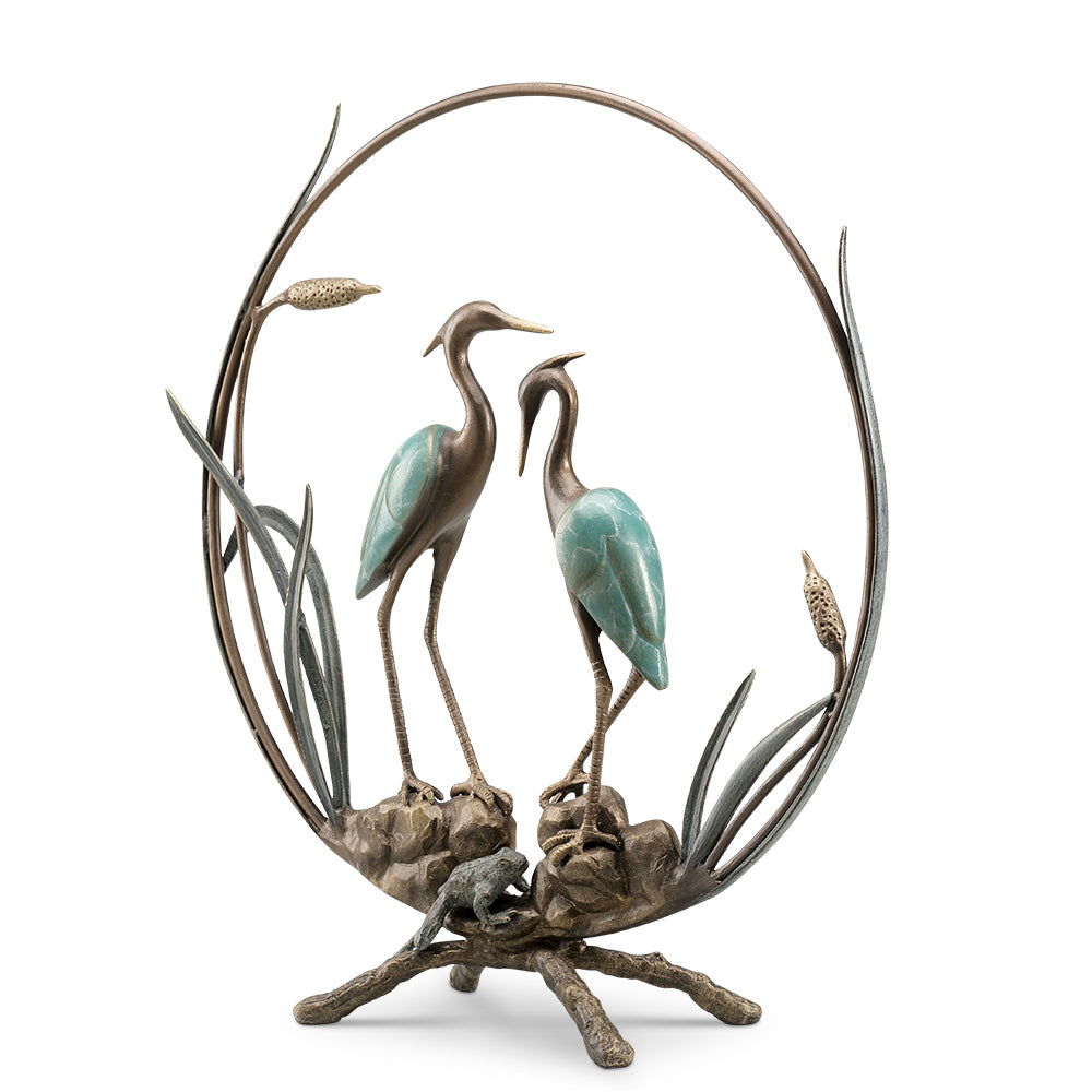 Graceful and symbolic, the SPI Home Heron Romantic Sculpture captures a serene moment between two herons in a beautifully stylized form. Crafted from durable aluminum with a bronze finish, this elegant sculpture evokes coastal tranquility and timeless romance. The tall, arched forms of the birds suggest movement and connection, making it a compelling centerpiece for garden landscapes, patios, or nature-themed interiors. Standing at 26.5 inches high, 25.5 inches wide, and 8 inches deep, this sculpture balances height with organic flow—ideal for display on pedestals, decks, or indoor spaces that celebrate natural harmony.