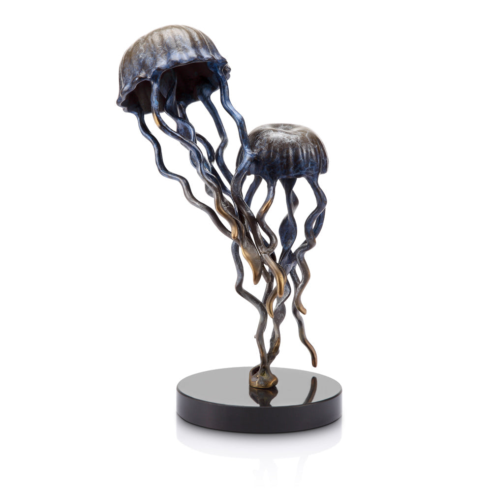 Add a touch of underwater elegance to your décor with the Jellyfish Pair on Base sculpture from SPI Home. Expertly crafted in solid brass, this artistic piece features two jellyfish suspended in flowing motion, their tentacles trailing gracefully as if drifting through ocean currents. Measuring 11 inches tall, the sculpture sits on a stable base and brings marine life artistry to bookshelves, desks, or side tables. Ideal for coastal or nautical interiors, this piece adds serenity and intrigue to any small space with its compact yet captivating design.
