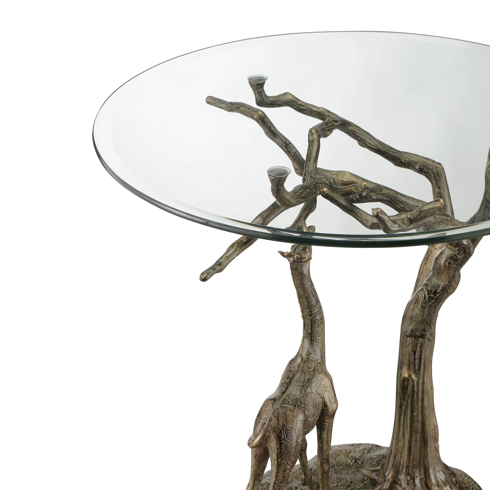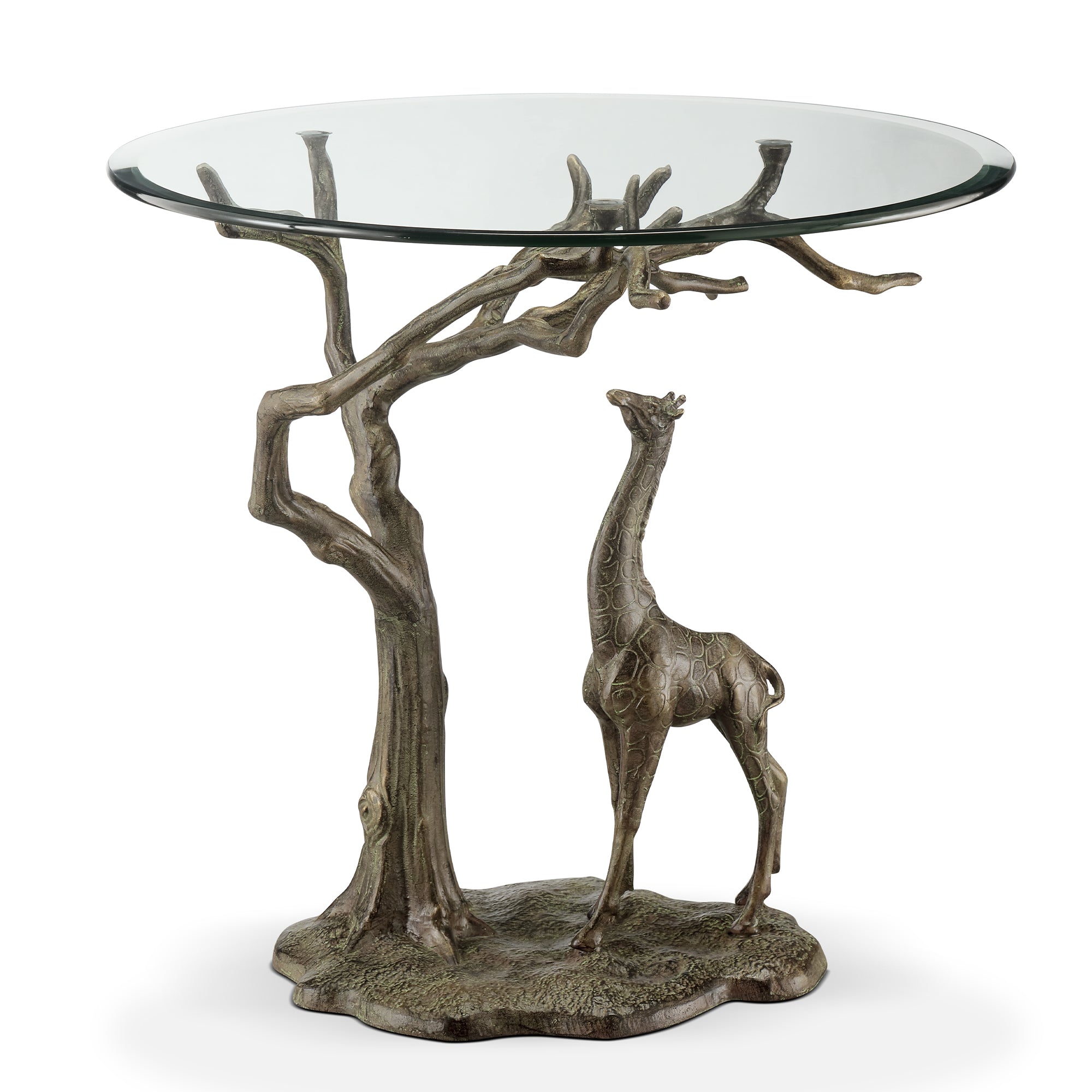 Bring the wild charm of the savannah into your home with the SPI Home Savannah Giraffe End Table. Standing 23 inches tall with a 24" x 24" footprint, this delightful accent table features a detailed giraffe sculpture beneath a round glass tabletop. Cast in durable aluminum and finished with earthy bronze tones, the base offers a sculptural quality that’s perfect for animal lovers and eclectic interiors. Whether styled in a sunroom, living room, or entryway, this indoor end table strikes a balance between artistry and function. Its clear glass top keeps the spotlight on the giraffe while offering a practical surface for daily use.