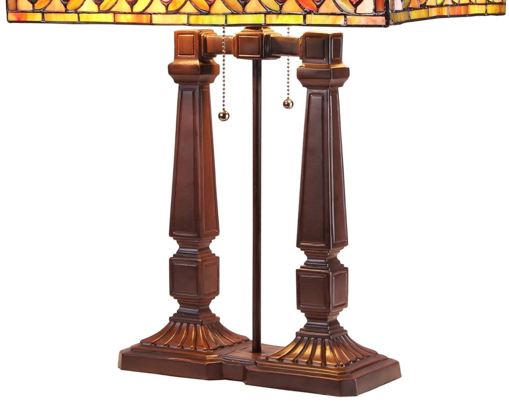 Elevate your interior with the timeless beauty of the SHERWIN Tiffany-Style Table Lamp, a masterfully crafted piece rooted in the Mission style. Hand-assembled stained glass panels in warm amber and earthy tones form a geometric design that radiates understated elegance.