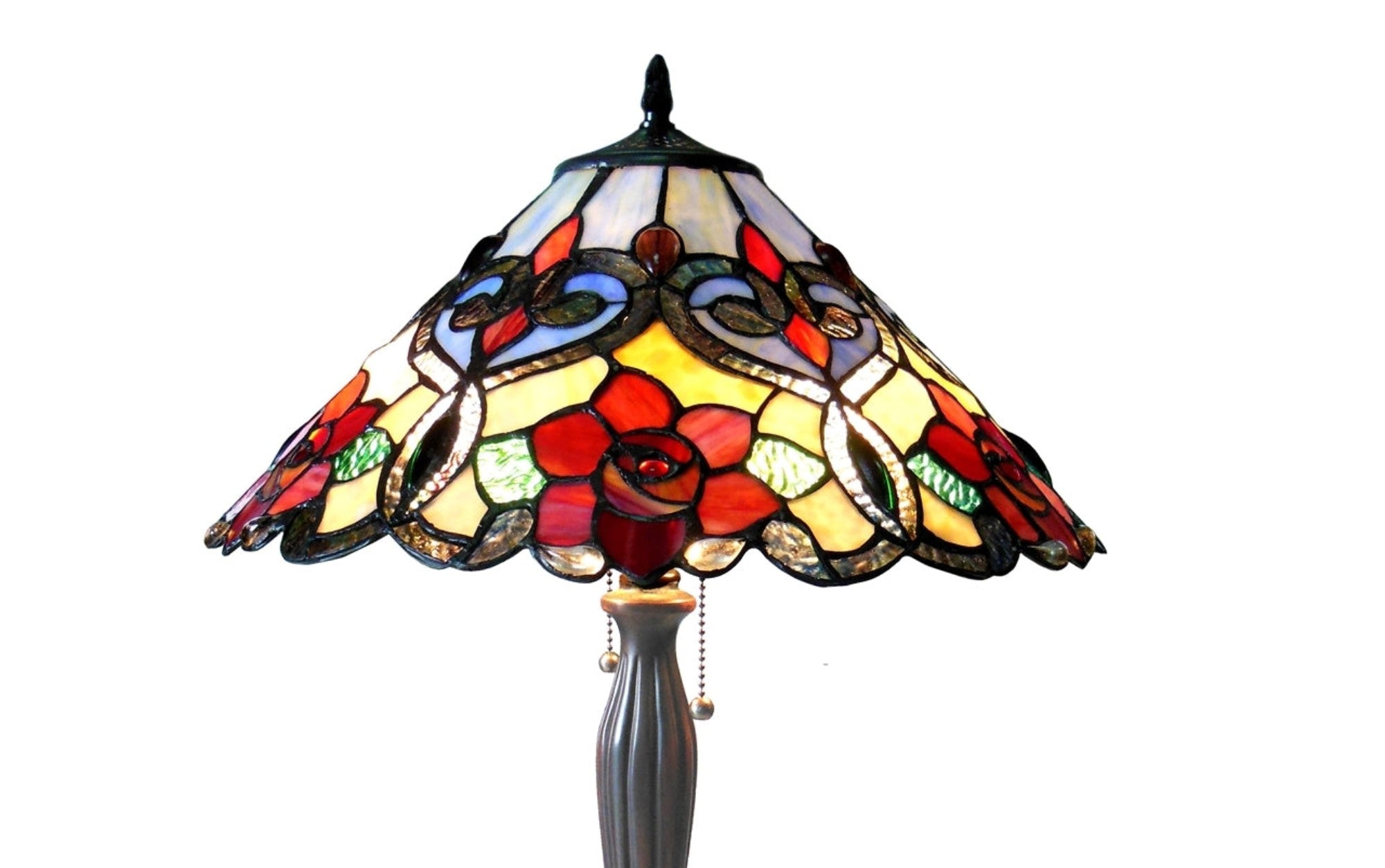 Infuse timeless Victorian beauty into your space with the Lindsay Tiffany-style table lamp. This captivating piece features a radiant roses motif with five red blossoms, artfully displayed in over 346 hand-cut stained glass pieces and 30 accent beads. Set atop an antique bronze-finished resin base, the rounded Tiffany-glass shade exudes warmth and charm, casting a soft, colorful glow downward. Ideal for living rooms, bedrooms, or reading corners, this lamp delivers enduring elegance.
