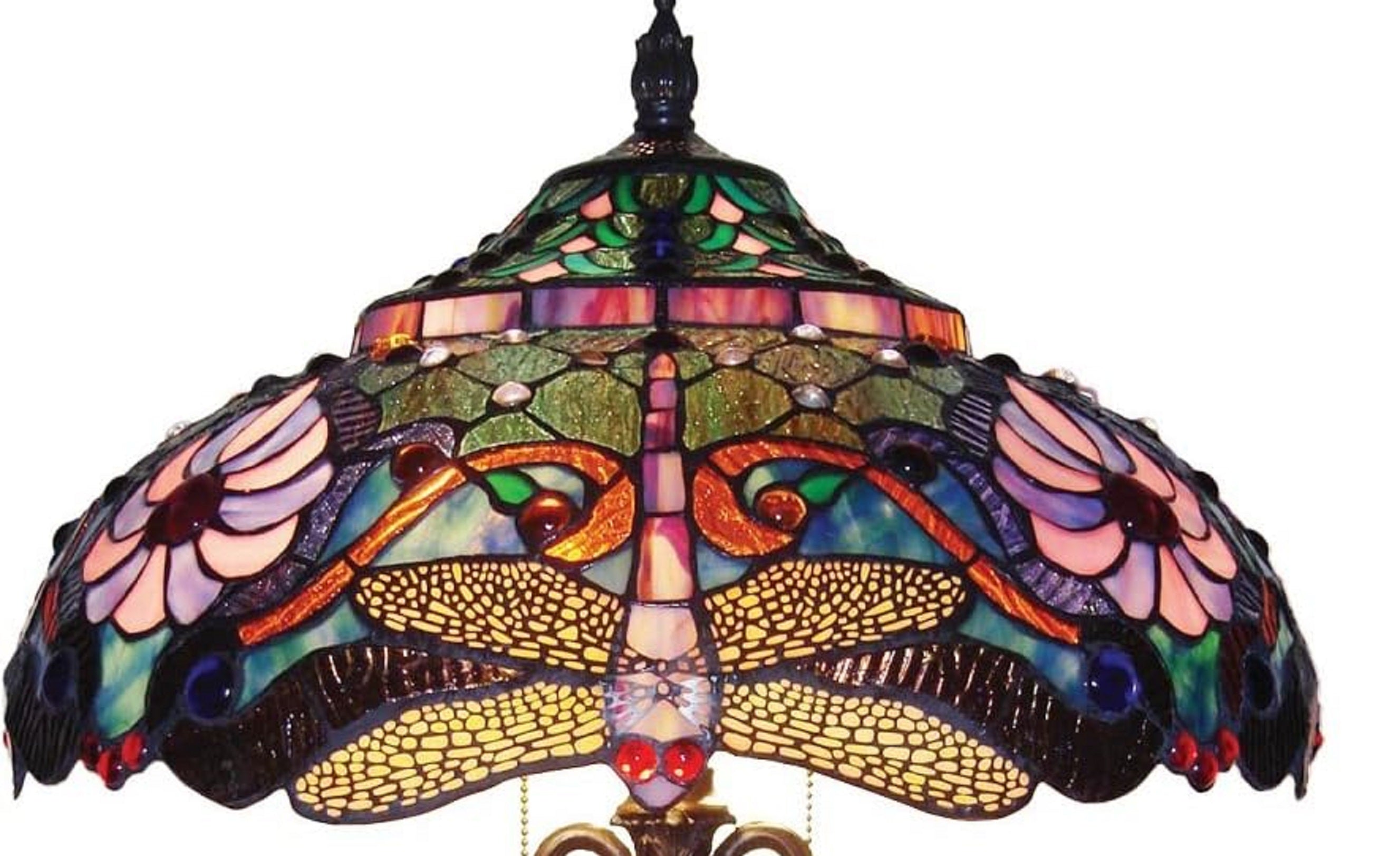 The Chloe Lighting CH1B145PD19-TL2 Zygo Tiffany-style 2 Light Dragonfly Table Lamp features a handcrafted shade made from over 590 pieces of stained glass and 128 glass beads, each wrapped in copper foil and soldered together—a technique developed by Louis Comfort Tiffany in the early 1900s. The lamp has a dark antique bronze finish and includes a pull chain switch. It is UL and CUL listed, suitable for indoor use.