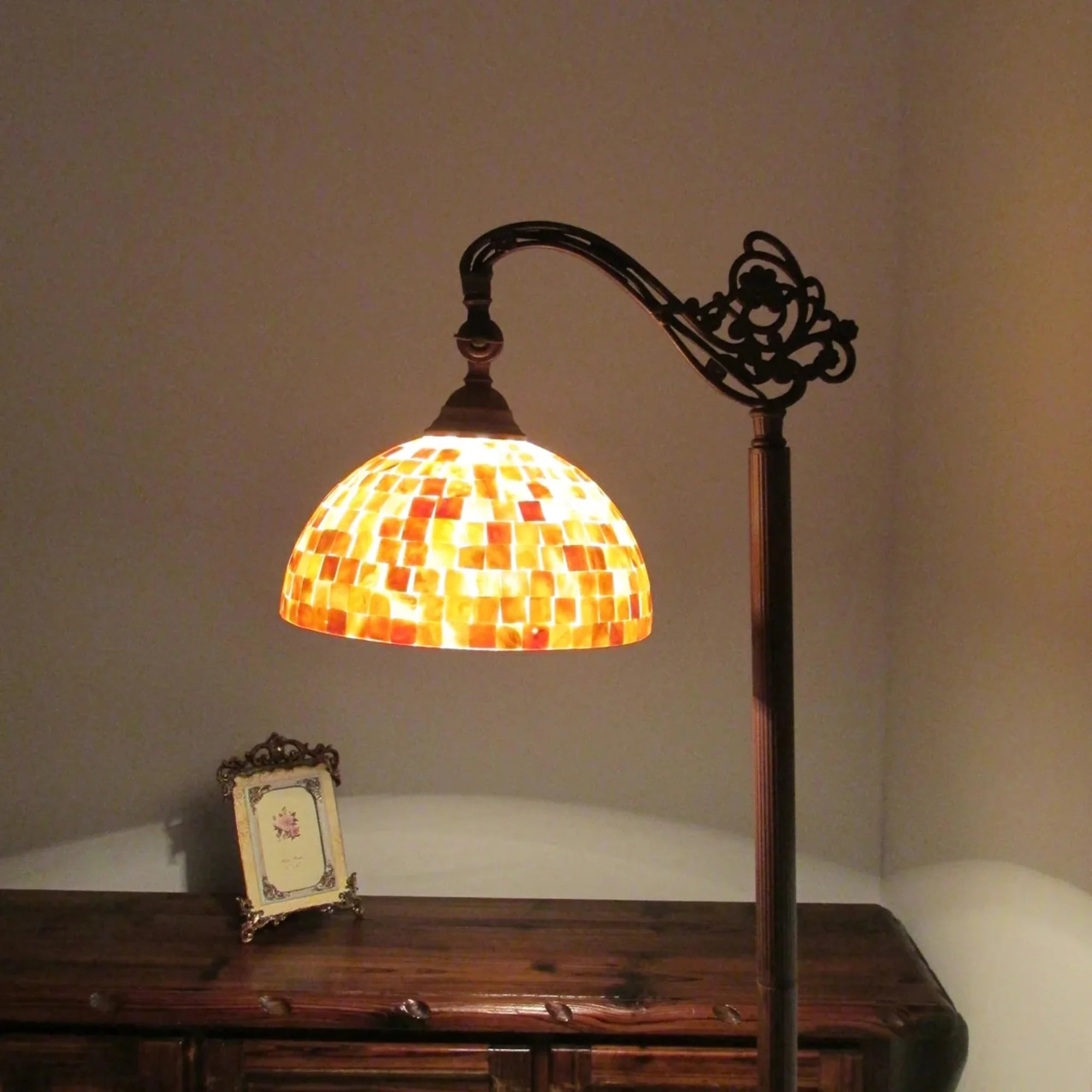 Add elegance and function to your reading corner with the Shelley Tiffany-style floor lamp. Featuring a hand-crafted mosaic glass shade with natural seashell inlays and multi-toned coloring, this downlight lamp radiates warmth and charm. Its sturdy resin and iron base in a blackish bronze finish supports a uniquely artistic shade that combines beauty with reliable performance. Includes an on-cord foot stepper switch and 87" electric wire for convenience.
