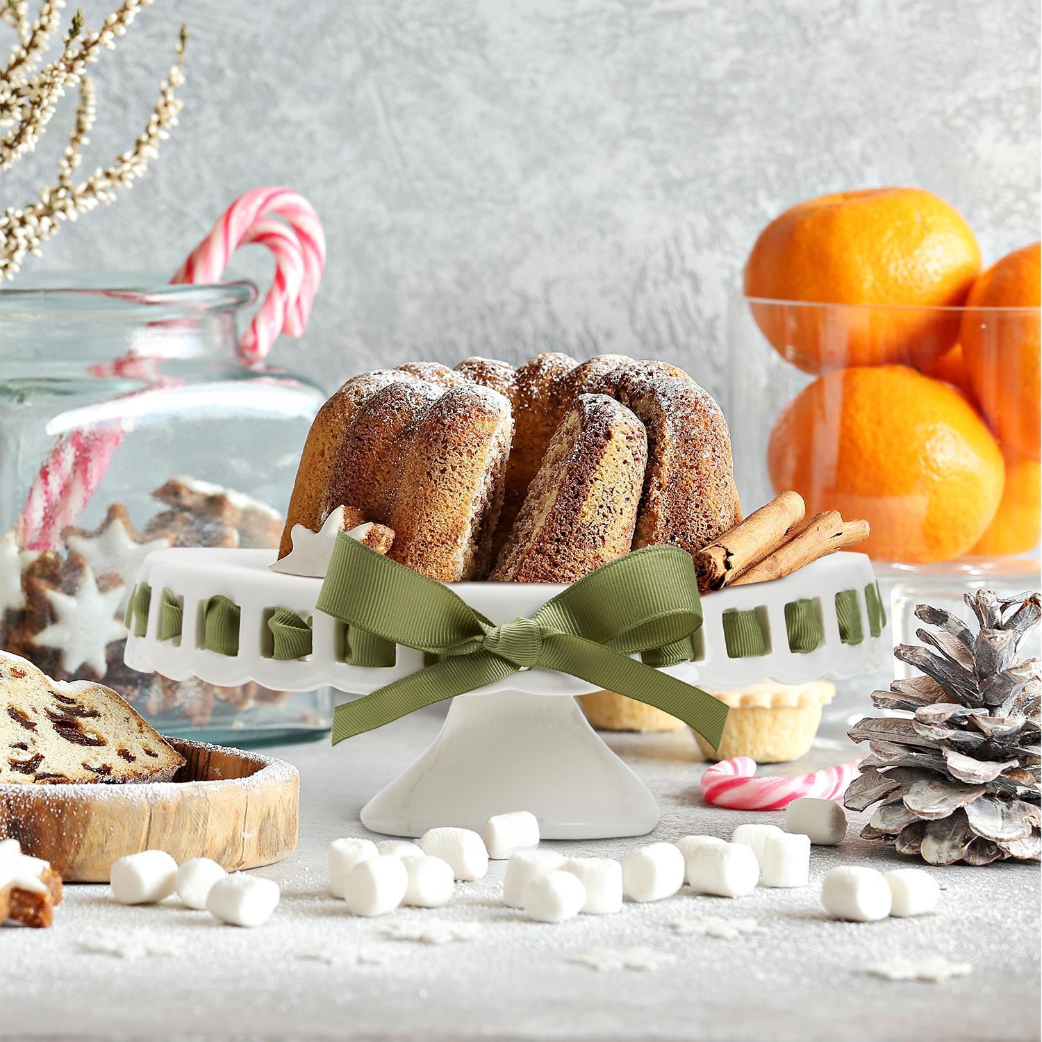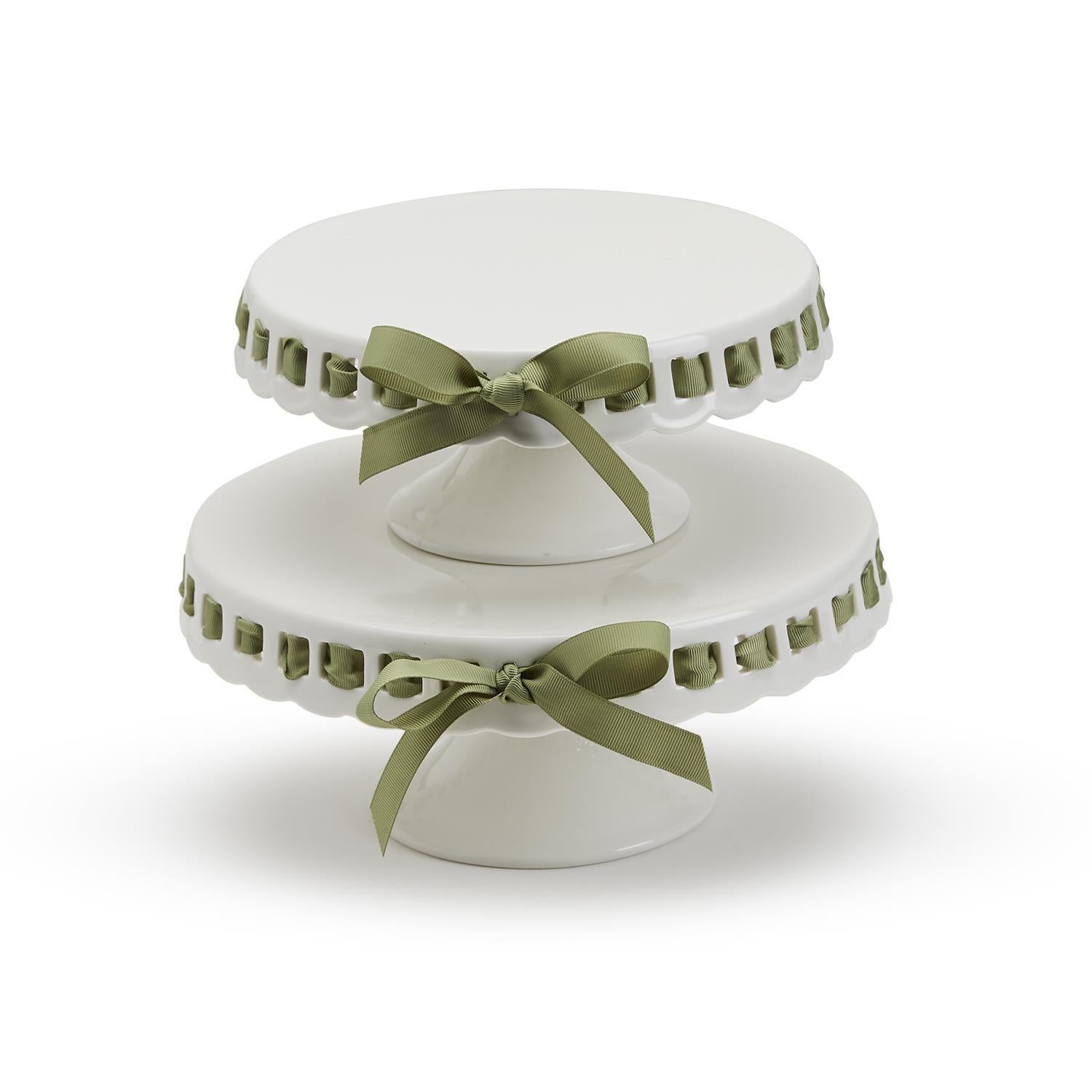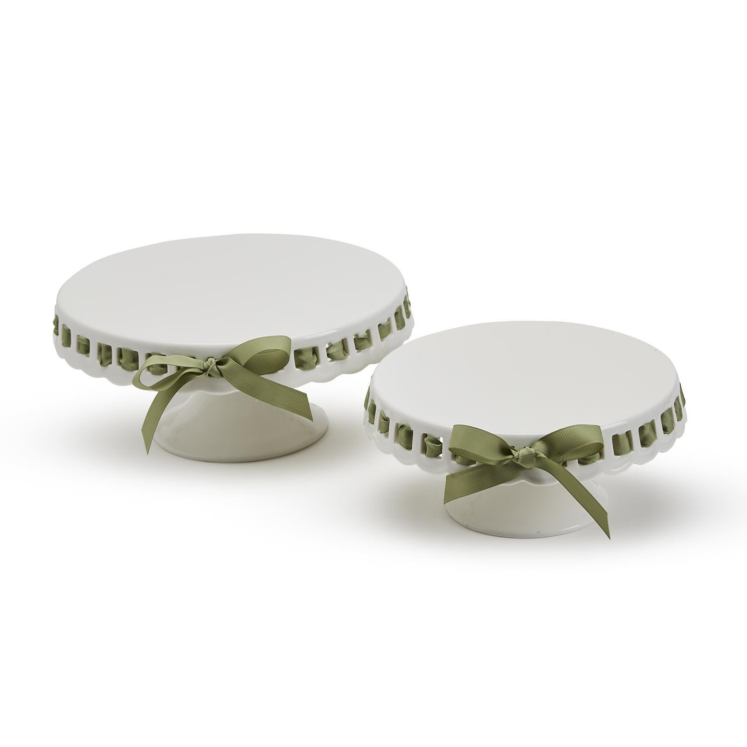 Display your sweetest delicacies with this set of 2 Victoria cake plateau. These charming dessert trays feature a sage green ribbon with bow accent. For long-lasting quality, these cake stands are handwash only. The round shape is perfect for holding warm pies, delightful cheesecakes, and other various pastries.