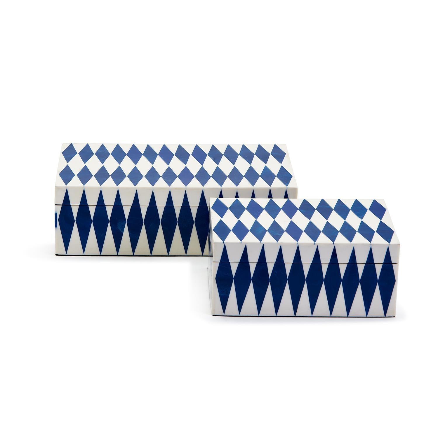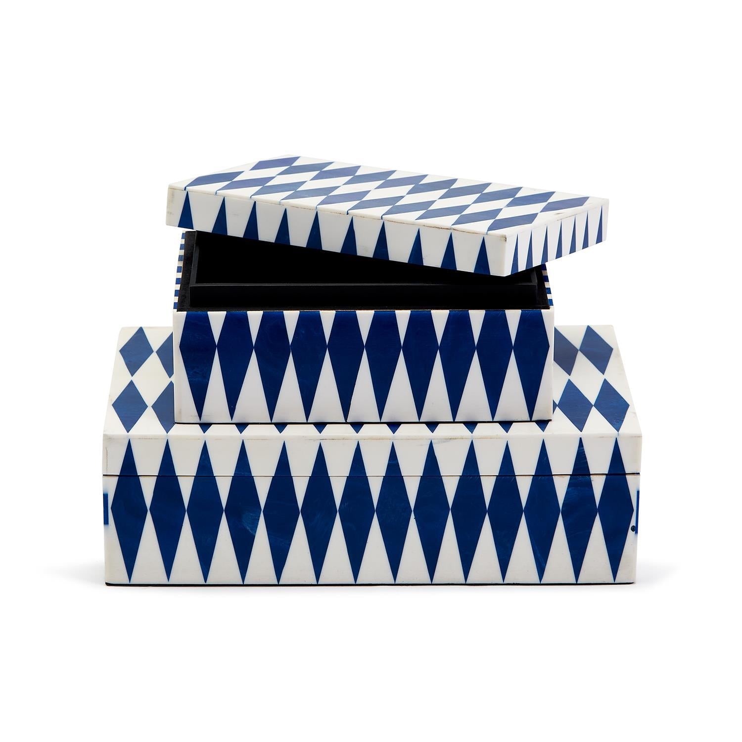 Featuring a hand-finished pattern in glossy resin, these boxes bring a brilliant blue hue and is sure to add dimensionality to your shelf, mantel, or tablescape. Keep your possessions handy but hidden. Perfect for stashing, stacking, or making a stand-alone statement.