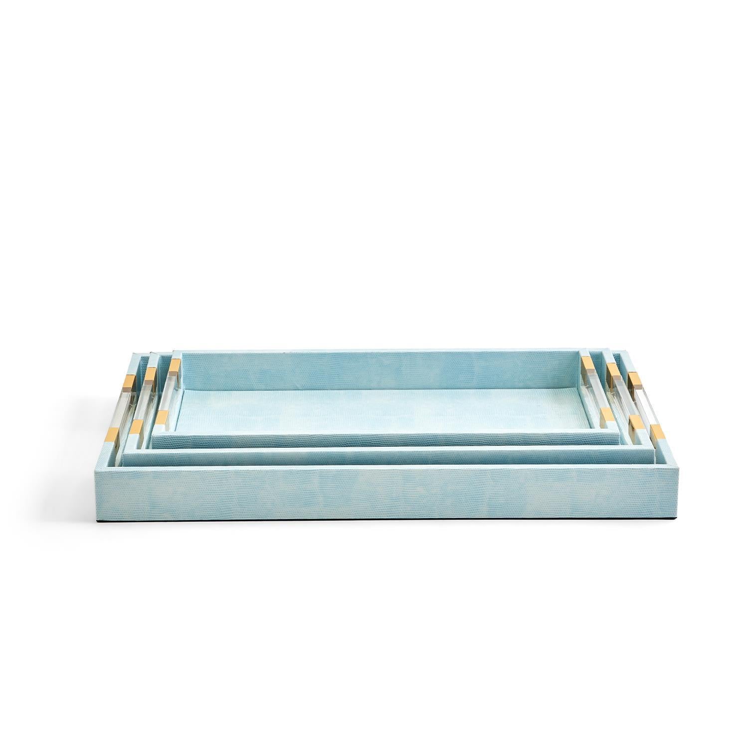 These elegant long faux stingray trays are accented with eye-catching stainless steel and acrylic accents. The trays create the perfect organizing element for corralling toiletries and cosmetics, transporting cocktails or grounding a chic tabletop vignette.