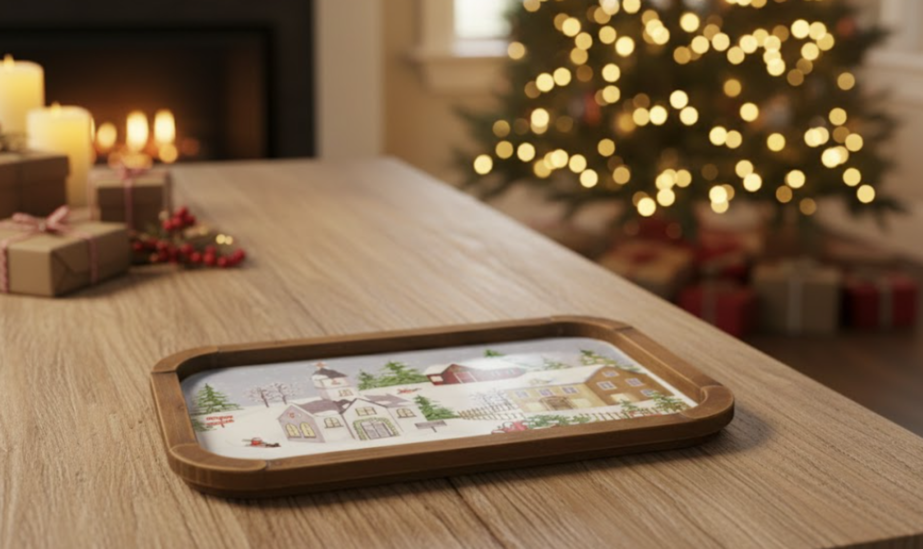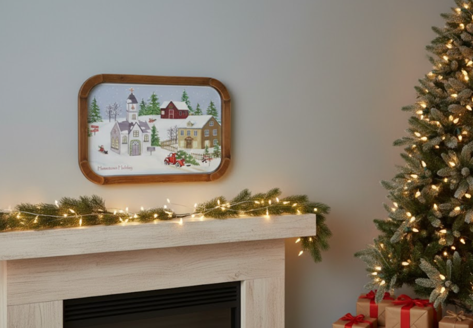 The Holiday Village Wall Art brings a warm and nostalgic seasonal touch to your home. Crafted from iron and MDF, this framed piece features a winter village scene complete with a church, house, and small truck in cool white and red tones. The slim profile makes it easy to display on a mantel, tabletop, or wall, adding a festive accent to classic, rustic, or traditional holiday décor. This piece offers a simple way to introduce a charming seasonal moment to entryways, living rooms, or gathering spaces. Its lightweight construction also makes it suitable for effortless placement or gifting during the holidays.