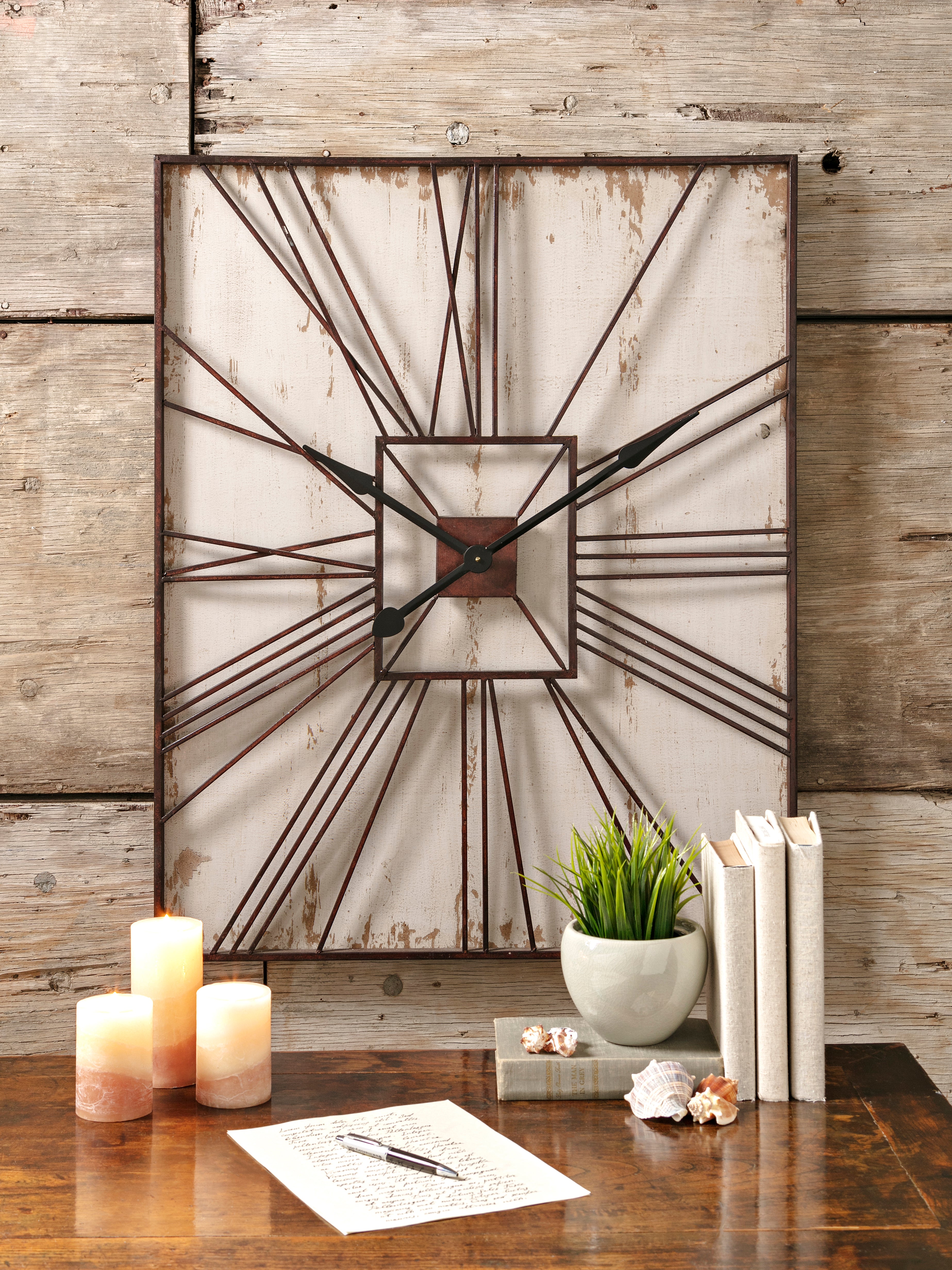 - Rustic wooden clock with rustic iron frame and Roman numerals makes a stylish wall accent