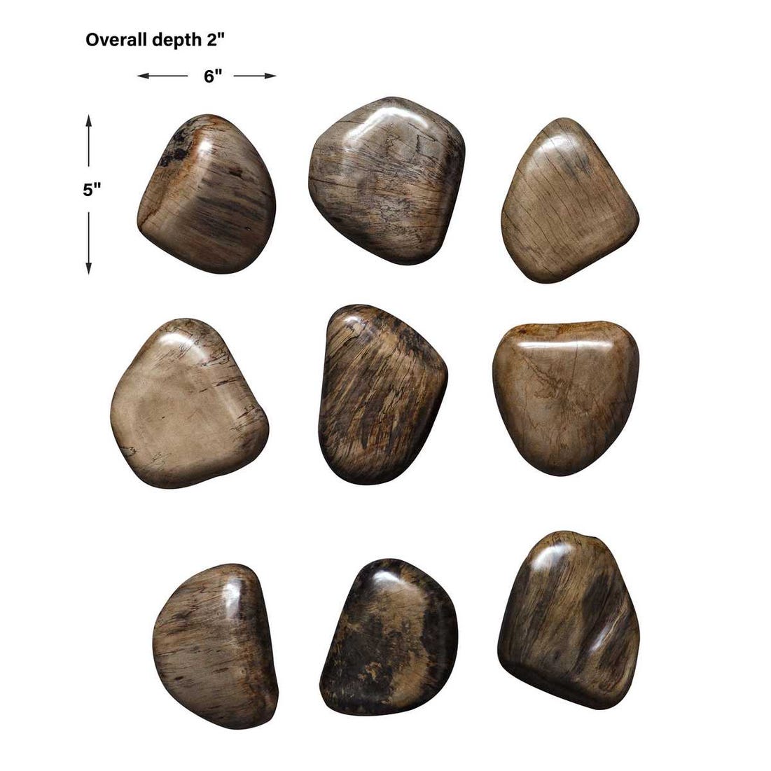 Bring nature’s calm elegance indoors with the Uttermost Pebbles Walnut Wood Wall Décor Set of 9. Crafted from solid Tamarind wood, each piece in this curated set mimics the organic form of smooth river pebbles, exuding earthy charm and contemporary warmth. The natural walnut finish highlights the rich grain and unique character of each element. Designed for versatile display, each pebble measures approximately 5" H x 6" W x 2" D, allowing for endless arrangement possibilities—whether grouped closely as a centerpiece or spaced out for a dynamic wall installation. This set transforms blank walls into an artistic statement with a soothing, minimalist aesthetic.