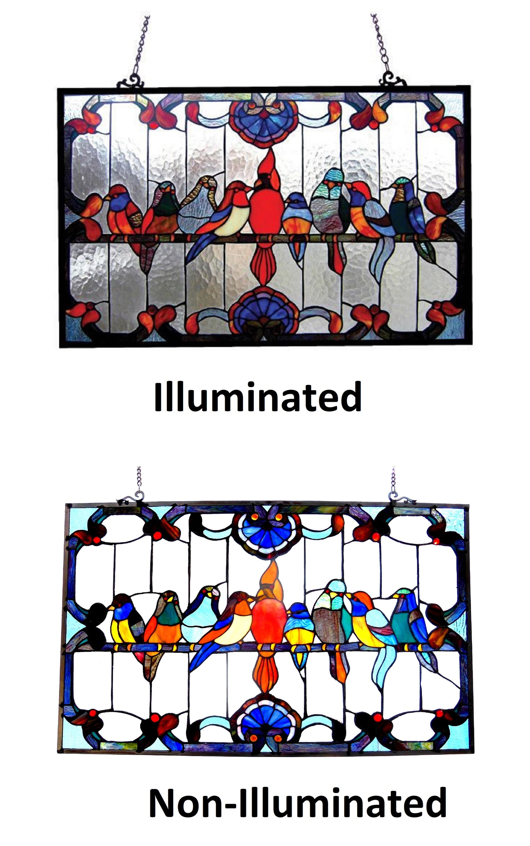 - Additional Warning or Disclaimers - Since these are hand crafted products, the exact color of glass pieces may vary. Colors of the glass will appear darker and less vibrant when not illuminated. Handmade glass will vary from one piece to the other; glass made at different times will also vary. Use the size under product specifications to determine the product size. Again, since these are hand crafted products, dimensions for all glass window panels and fireplace screens may vary from 1/4 to 1/2 inch. Stained glass product has been protected with mineral oil as part of the finishing process. Please use a soft dry cloth to remove any excess oil.