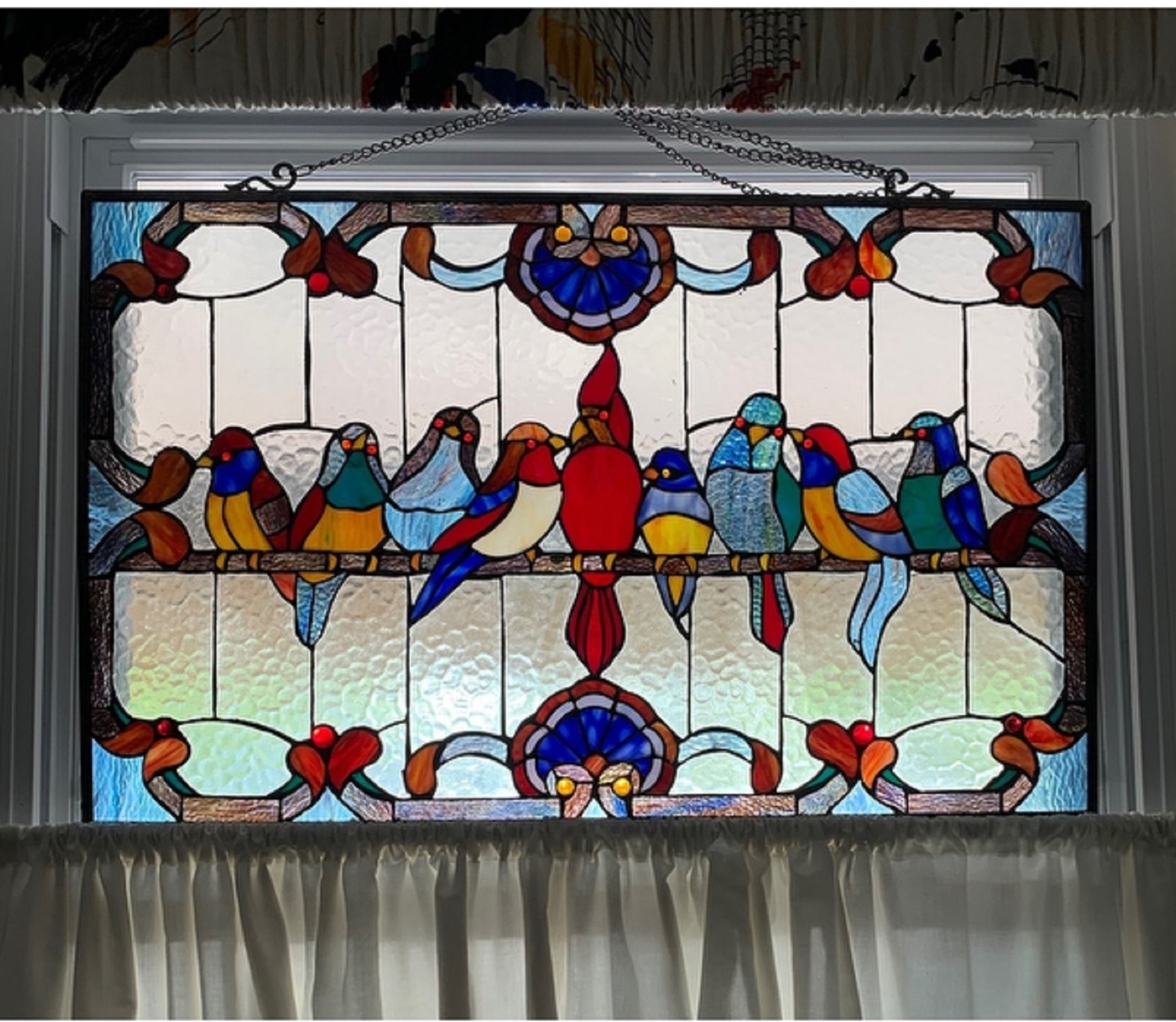 A festival of birds are featured: blue jay, songbird, woodpecker, cardinal, finch, tanager, king fisher, dove, sparrow and the one in the middle is the blue bird of happiness, said to bring happiness, cheerfulness, prosperity, hearth and home, good health, new births, the renewal of springtime. This piece would be a heartfelt gift to anyone. The background glass is made of ripples; a wonderful way to enjoy the morning sun! The stained glass panel is crafted with 139 pieces of glass and 8 cabochons.