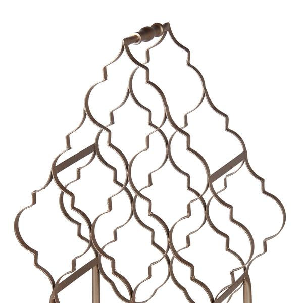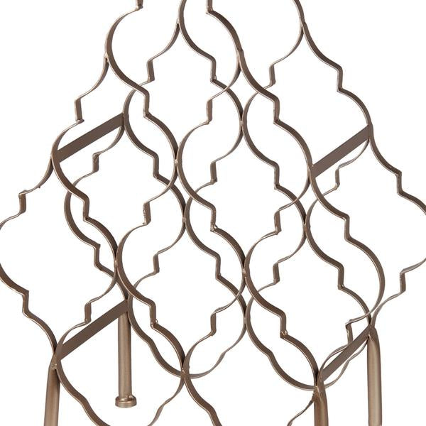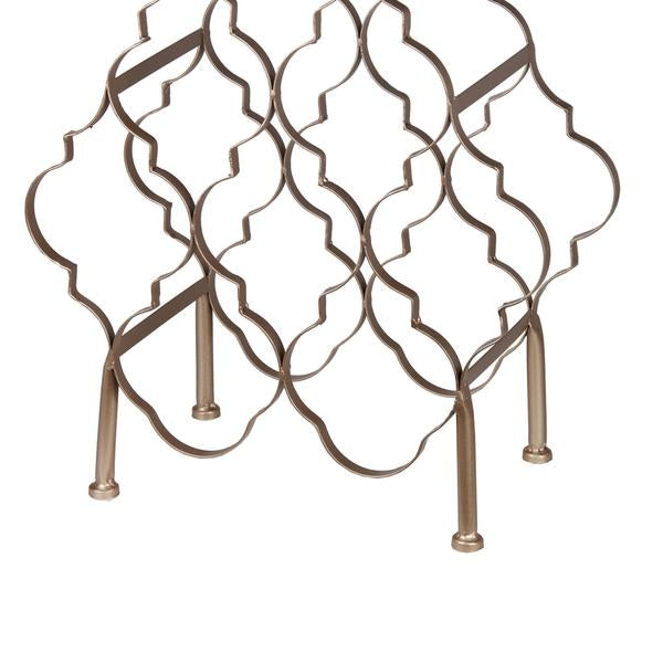 Adorn your bar counter space with the addition of this contemporary style wine rack featuring lattice designs and stable supporting legs and is accented with silver champagne hand finish which provides a ravishing appeal. It is completely crafted from iron which provides a durable experience and has a wine holding capacity of thirteen. It will be a great addition to your home and your bar space.