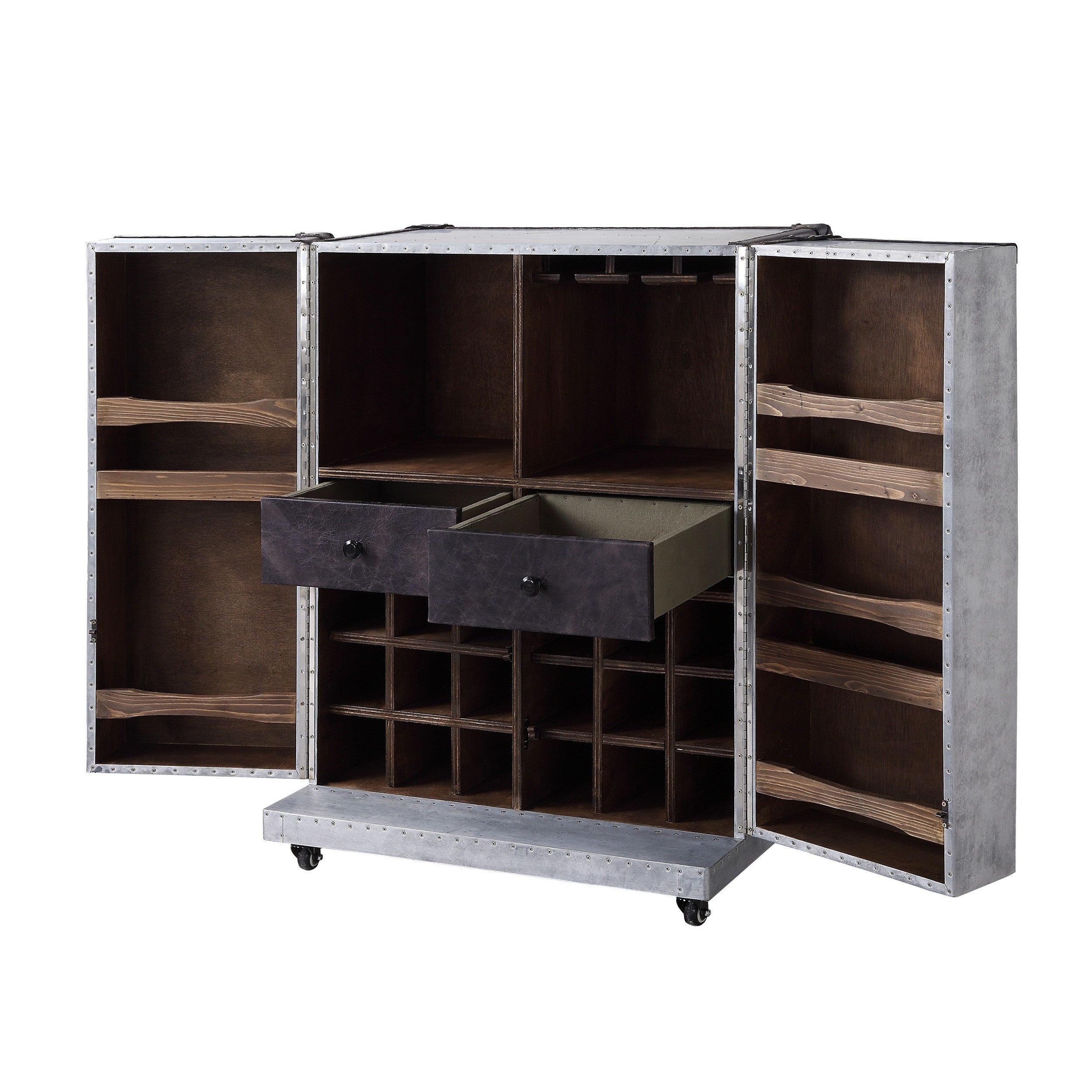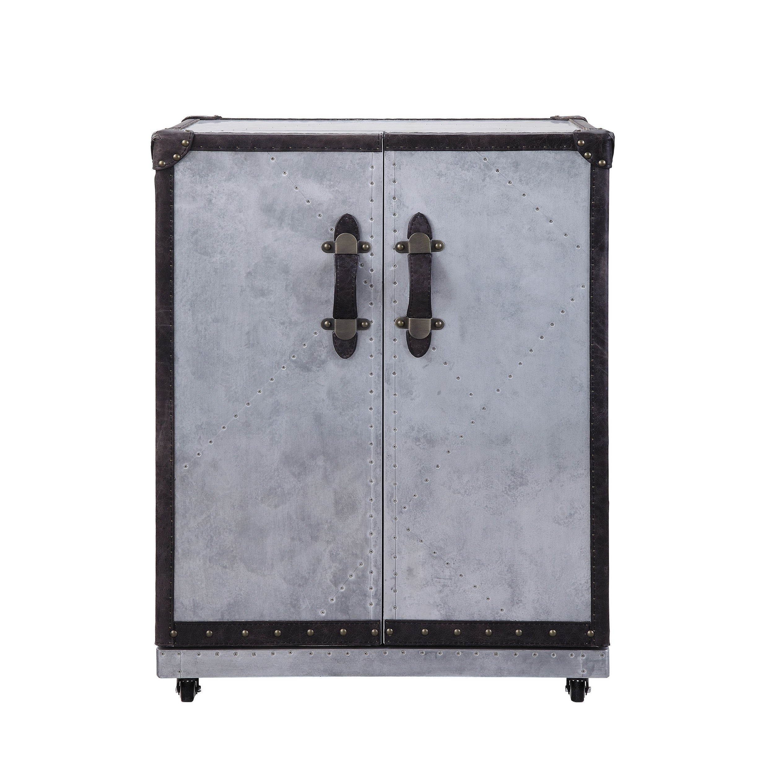 Get more storage at your home along with an industrial touch by the inclusion of this amazing wine cabinet. Constructed from solid wood, it features aluminum exterior with nailhead trim details and showcases leatherette accents. It incorporates 2 doors with leatherette handles, giving access to multiple storage options inside.