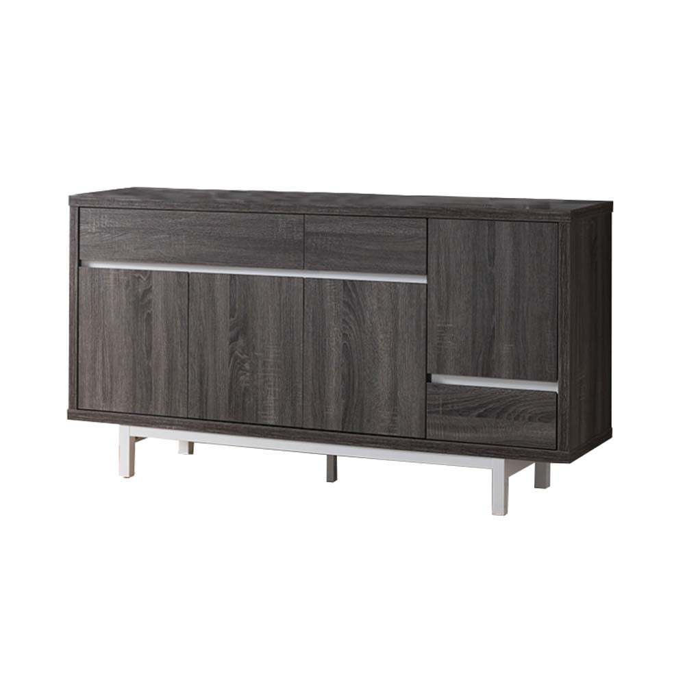 This multi functional buffet is perfect to hold a center piece of attraction in your any room setting. Featuring a modest design with multi storage space offers a complete solution for any corner of your home. Sturdily made up of wood, this features a distressed gray finish with white colored feet. This buffet consists three drawers, two Interior shelves under two door cabinet, one wine compartment and one wine glass rack. Table top can be used to keep lamps, vases, and expensive wines on display where other cabinets will allow you to place all utensils and commodities easily. This buffet will bring a beautiful accent to your place with adding a contemporary flair.