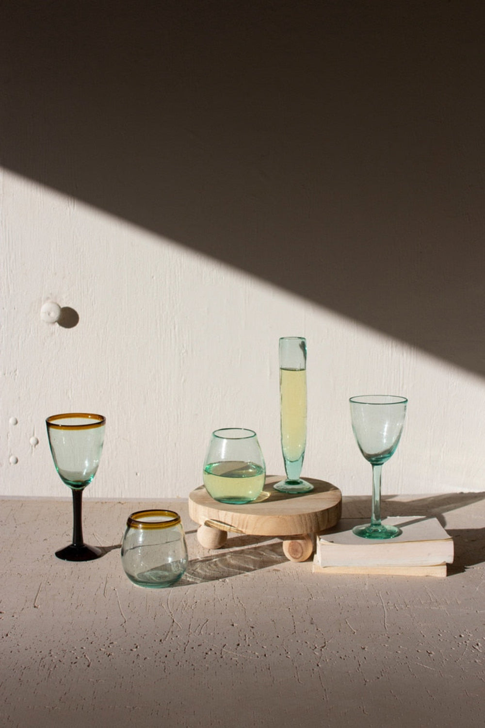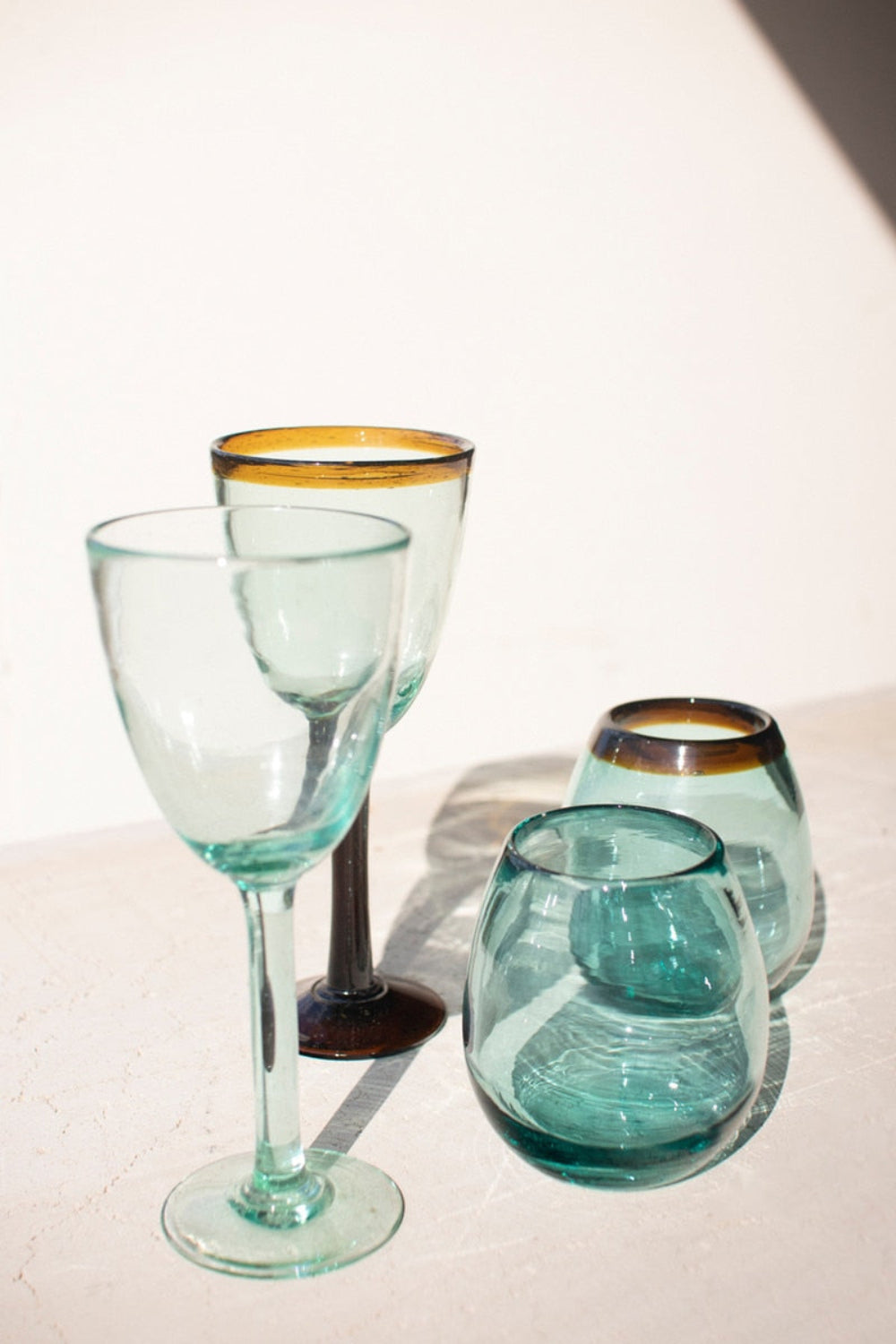 Hand-blown by artisans in Colombia, this recycled glass wine stemware set offers an authentic, artisanal feel. Each glass holds 11 oz and features amber-brown accents around the rim and stem, giving the collection a warm, handcrafted character. Subtle bubbles within the transparent glass surface highlight the individuality of each piece.
