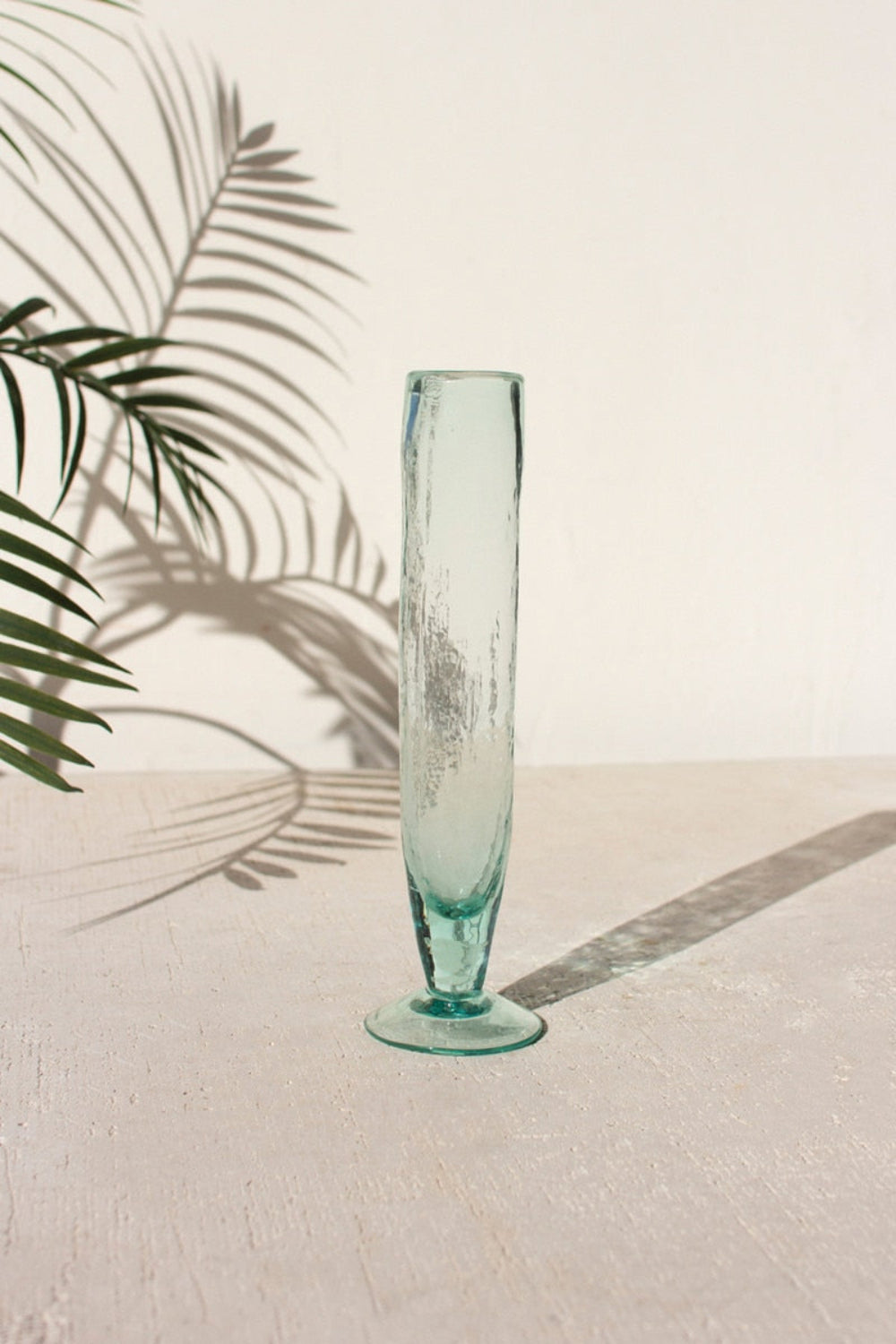 Handcrafted by skilled Colombian artisans, this set of six recycled glass champagne flutes brings a fresh, artisanal twist to classic celebration glassware. Each flute is mouthblown using thick, repurposed glass, resulting in natural variations and subtle bubble textures that make every piece one-of-a-kind. Standing at 10" tall, these clear, transparent flutes beautifully showcase sparkling wine, prosecco, mimosas, and festive cocktails. Whether for gatherings, special occasions, or weekend celebrations, this eco-conscious glass set adds elegance and artistry to any table.
