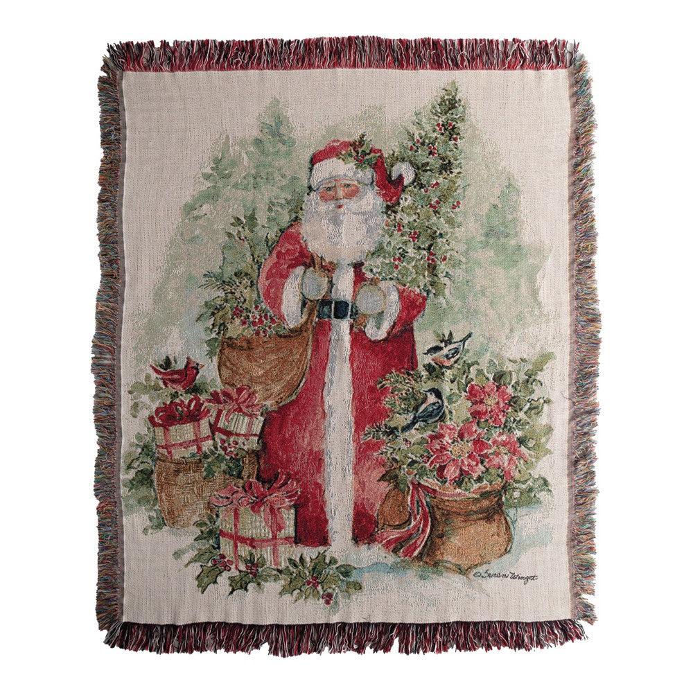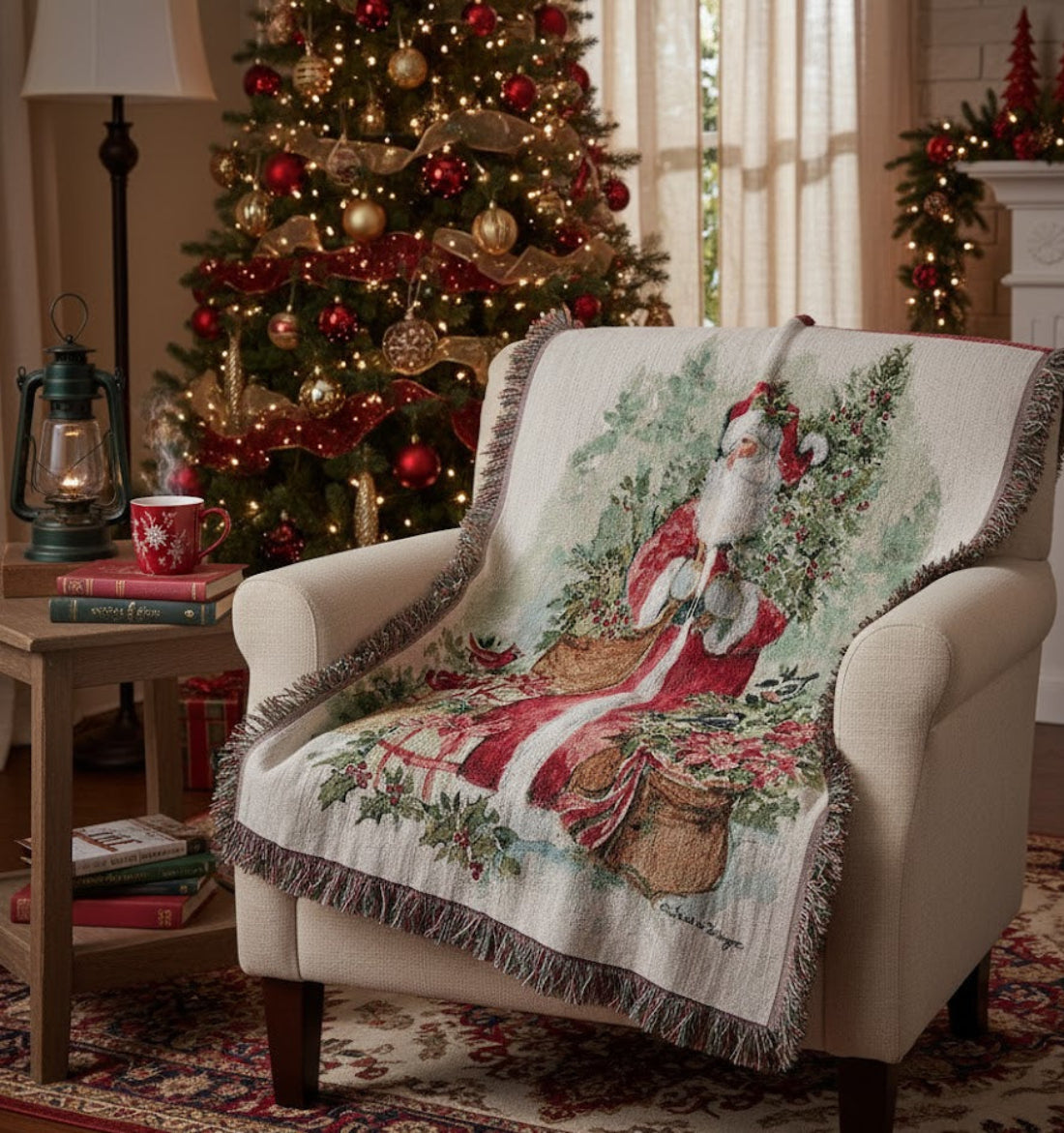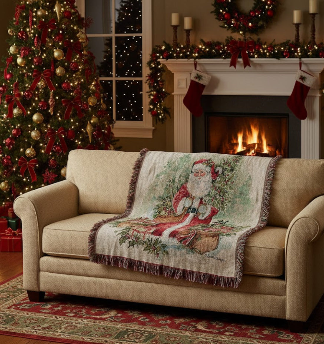50x60 Inch Holly and Pine Santa Throw – Cotton Woven Christmas Decor by Manual Woodworkers