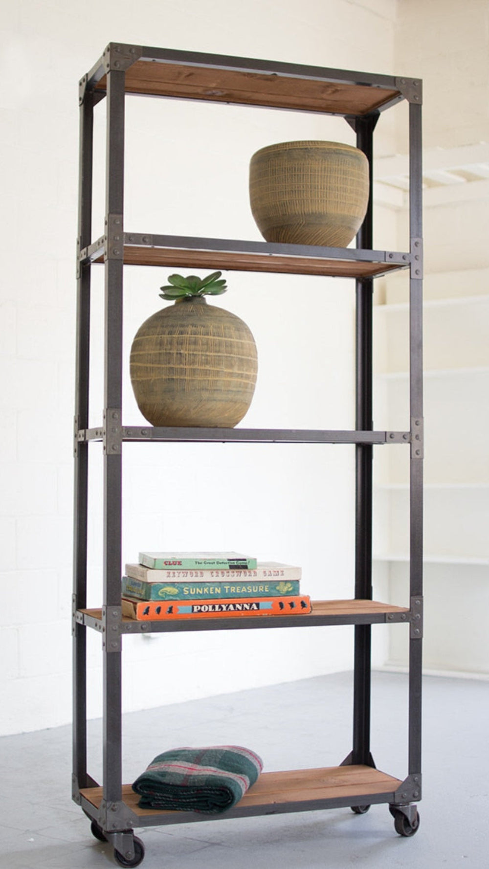- Create vertical storage with this tall iron and recycled wood shelving unit by Kalalou.