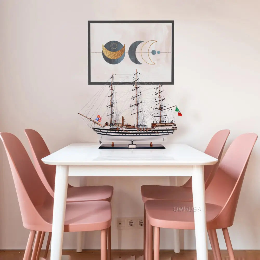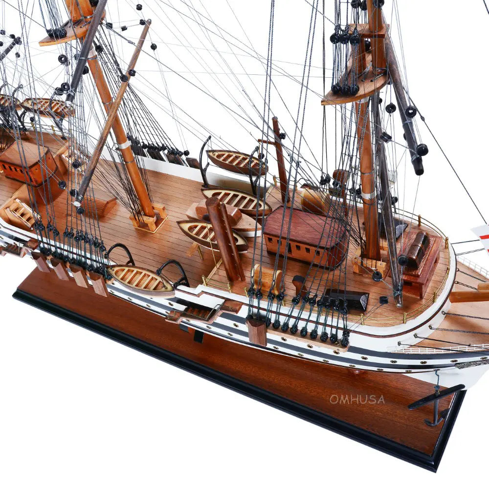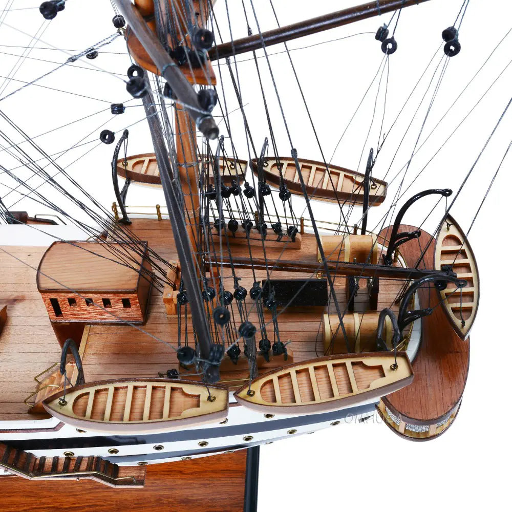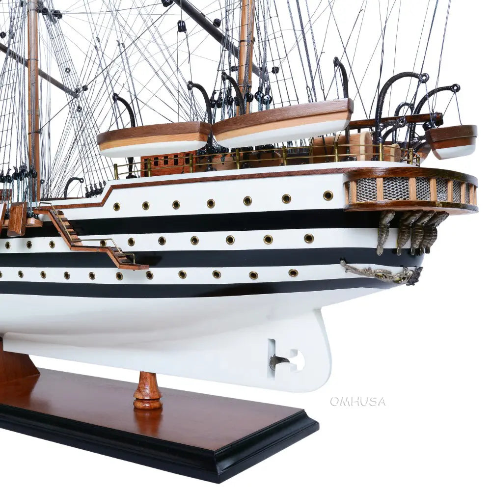 This 36-inch handcrafted replica of the Amerigo Vespucci brings maritime history to life with intricate detail and museum-quality craftsmanship. Made from high-grade woods like rosewood and mahogany, the model is hand-built using traditional plank-on-frame methods. The hull features a striking two-tone black and white paint scheme, with three full masts, authentic rigging, and lifeboats held by miniature cranes. The ship measures 36" L × 9" W × 32" H and rests on a solid wood base with a brass nameplate. This collectible is ideal for home or office display and makes an exceptional gift for sailing enthusiasts and collectors alike.