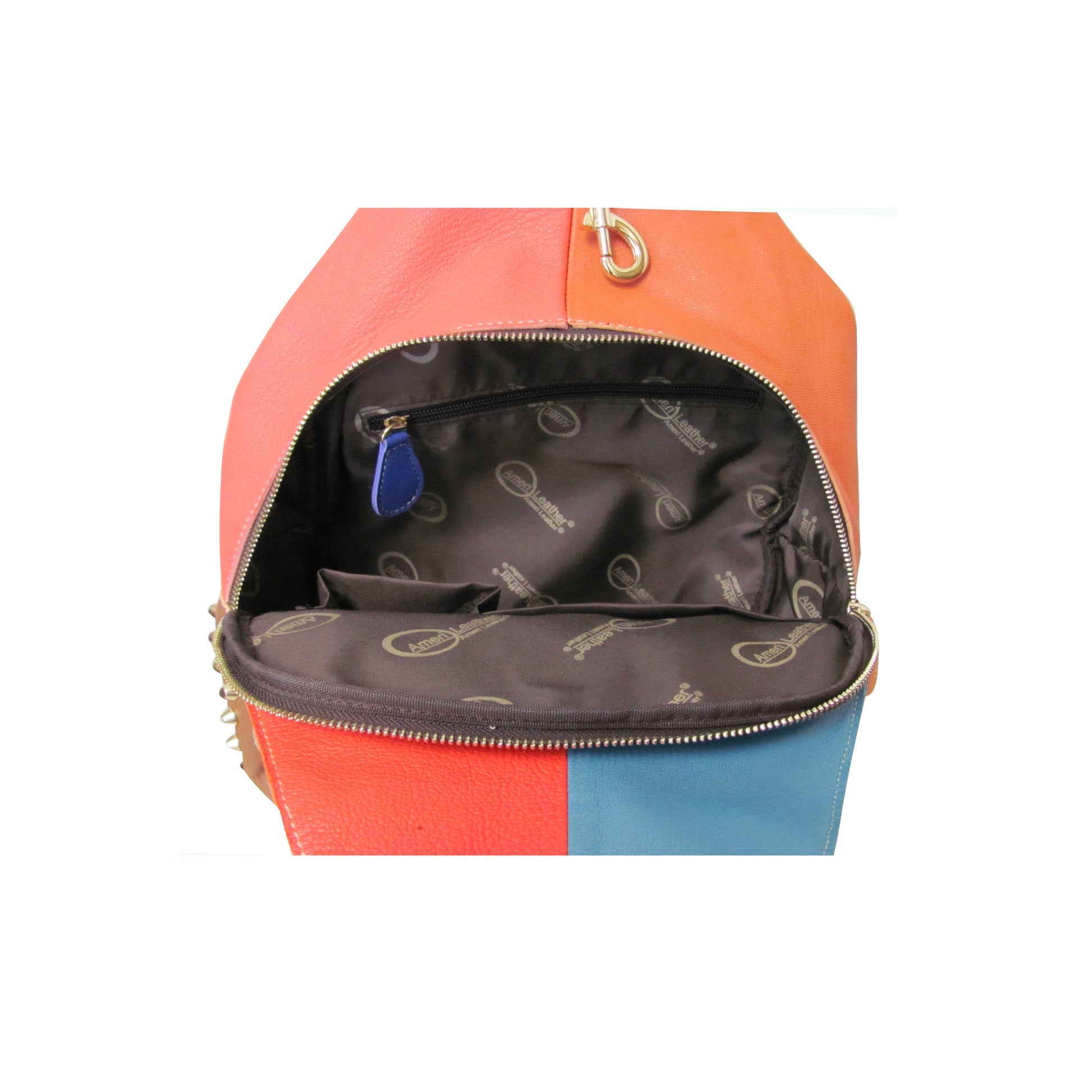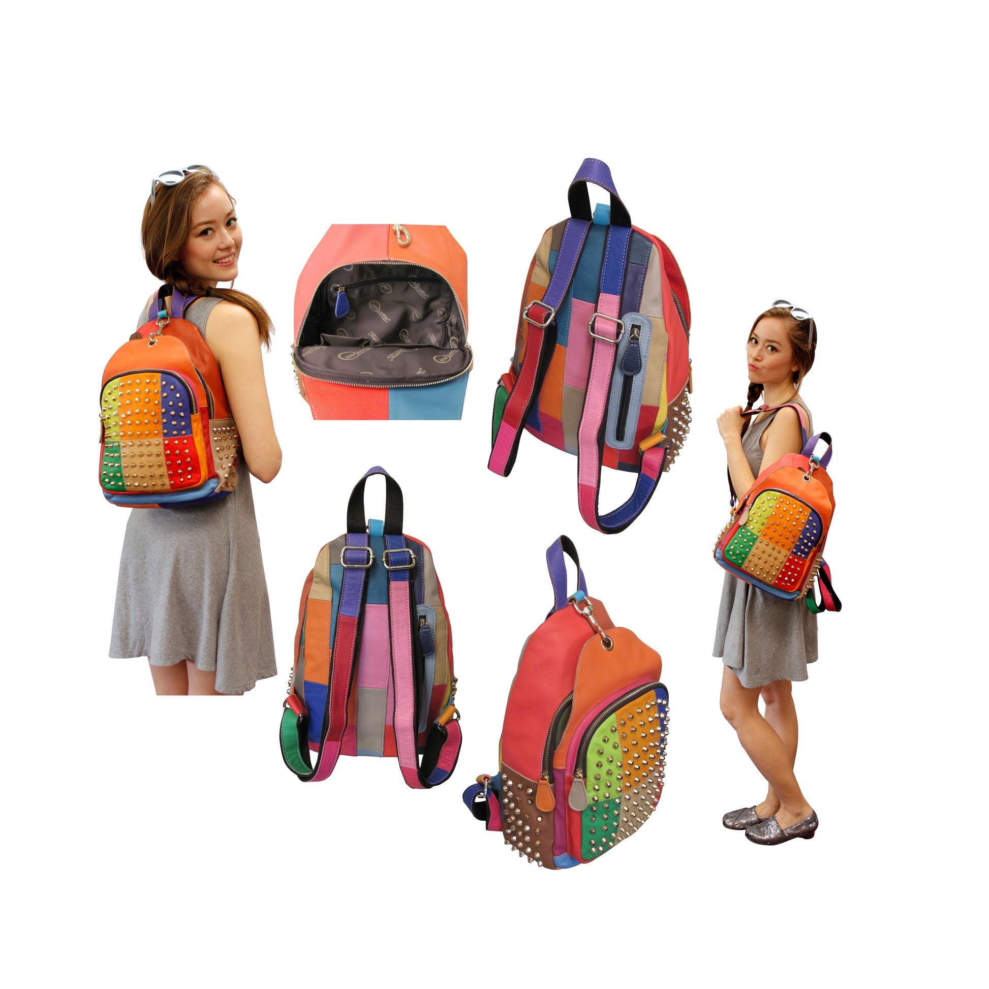 Amerileather Borka bag,boho leather backpack,bold style backpack,casual leather backpack,colorful backpack purse,compact leather backpack,designer style backpack,edgy leather backpack,handcrafted leather bag,lambskin backpack,leather bag with coin purse,leather fashion backpack,multicolor leather backpack,patchwork backpack,statement leather bag,studded leather backpack,stylish women’s backpack,top zip backpack,women's leather backpack